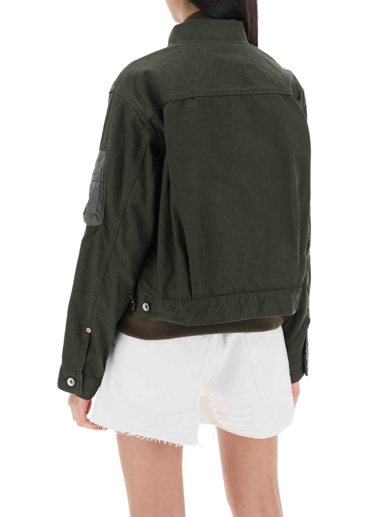 The Sacai denim jacket features a short and boxy cut with two front pockets and pleated details along the button placket. It stands out for its layered construction, thanks to the integrated tonal nylon liner inspired by bomber jackets, complete with a zip closure and ribbed knit finishes. The jacket is completed by a utility pocket on the sleeve and side slits with snap buttons. The model is 177 cm tall and wears size 2.