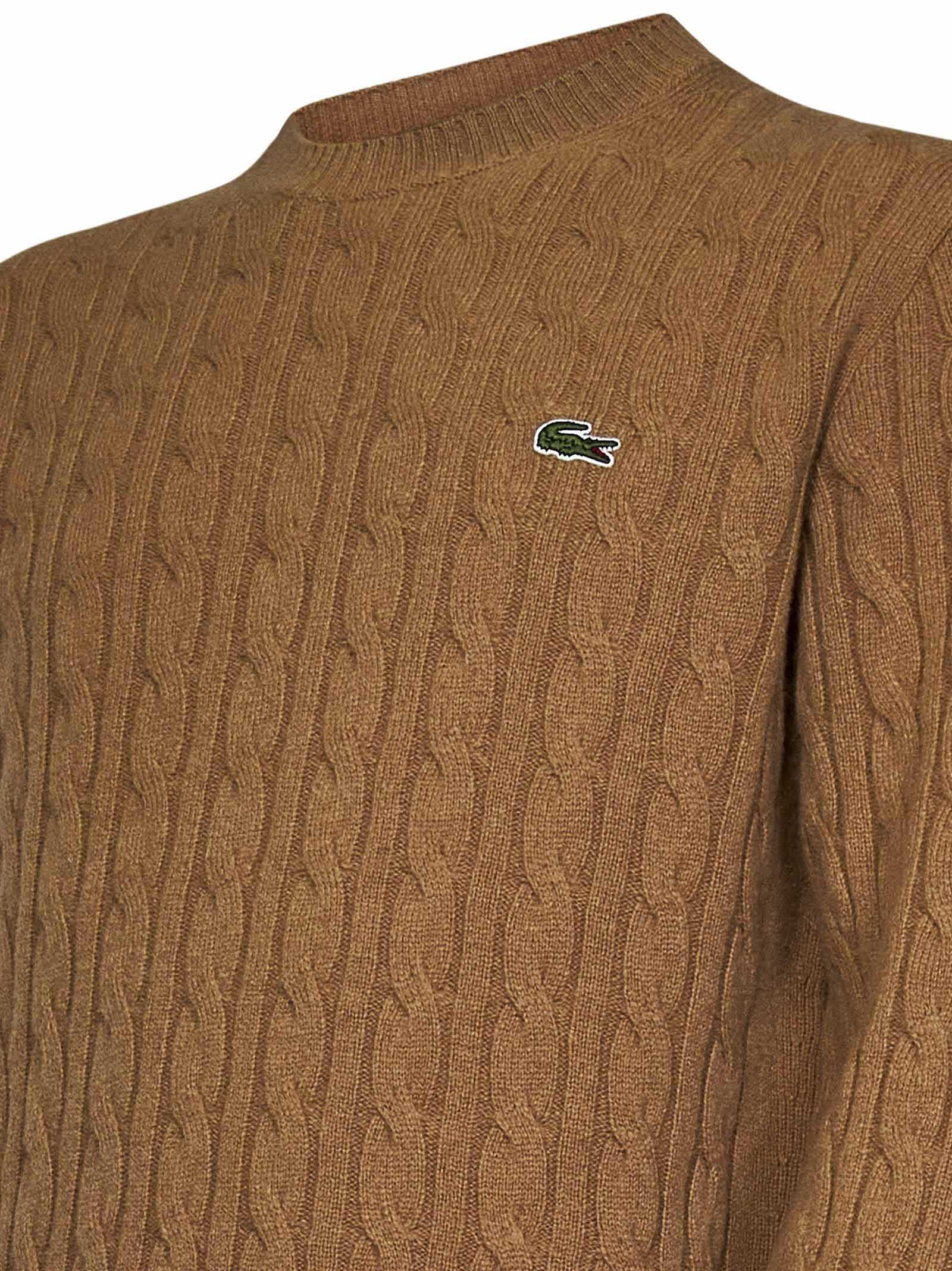 Camel-colored cable-knit wool crew neck sweater with crocodile on the chest.