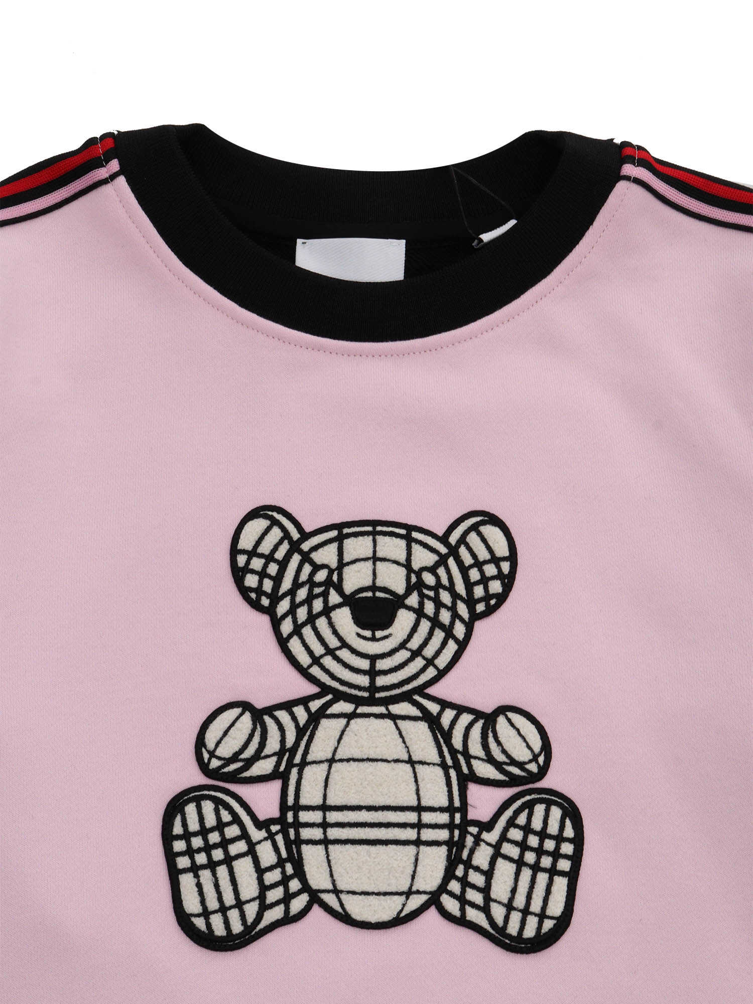 Burberry girls' pink and black sweatshirt with teddy bear embroidery, crew neck, web stripes on the sleeves, black back.