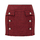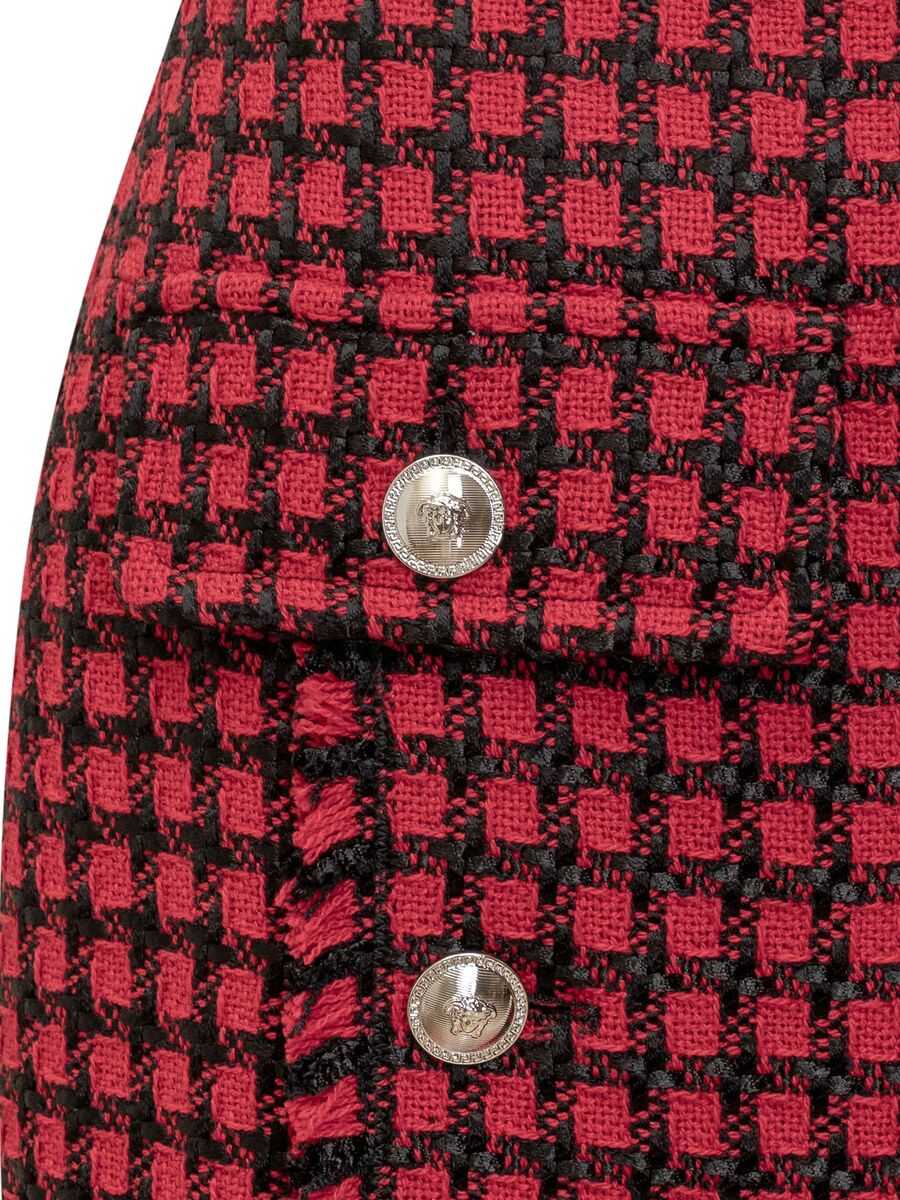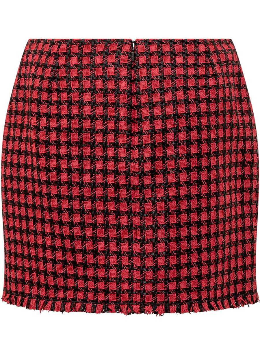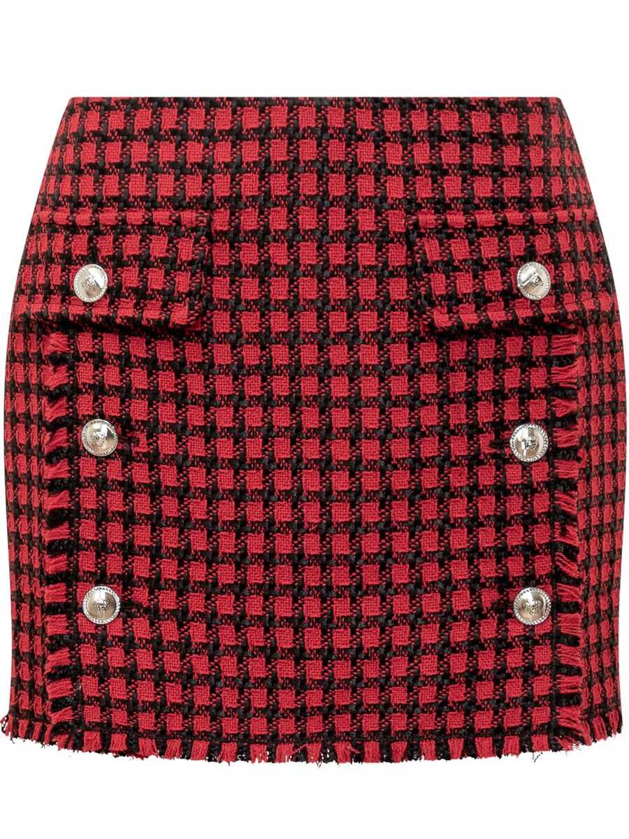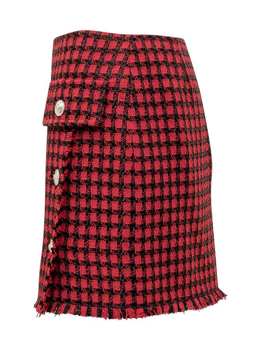 Wool blend short skirt. Red and black check pattern. Applied logo buttons. Zipper and hook-and-eye closure at back.