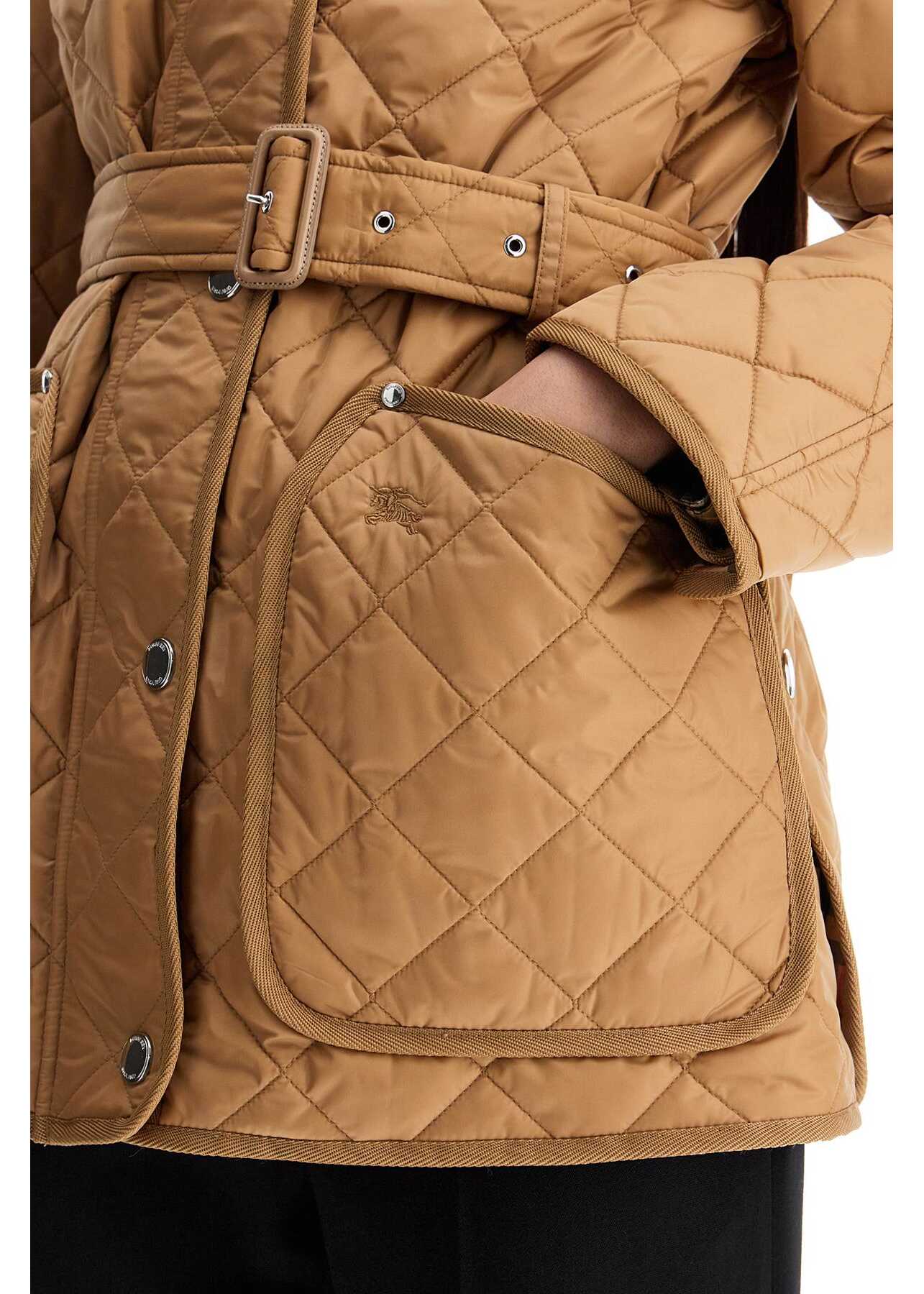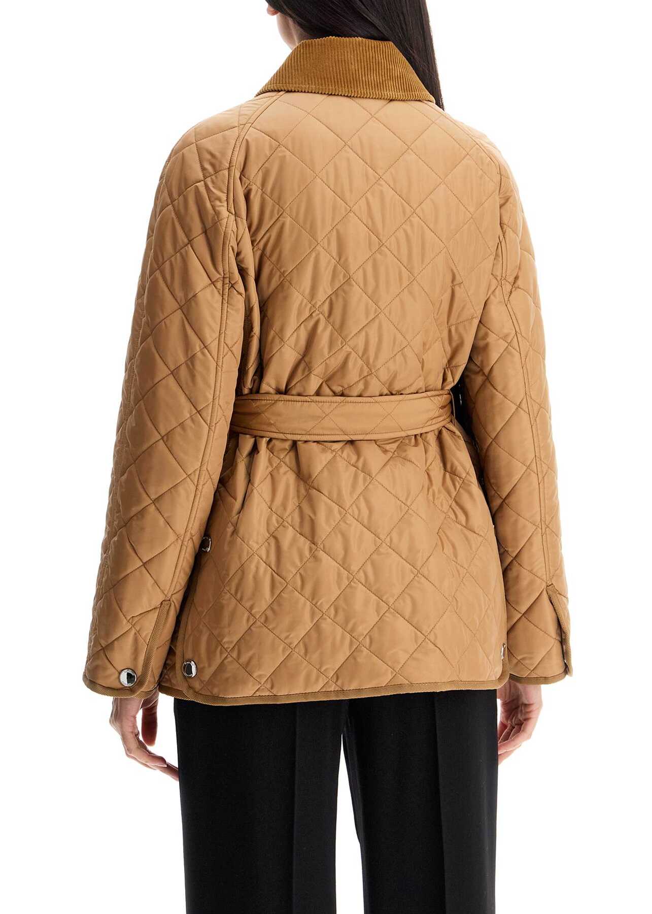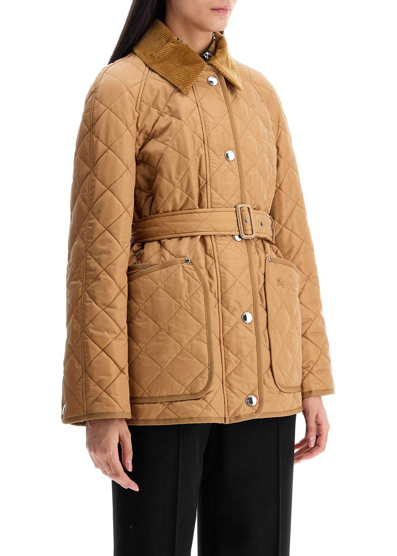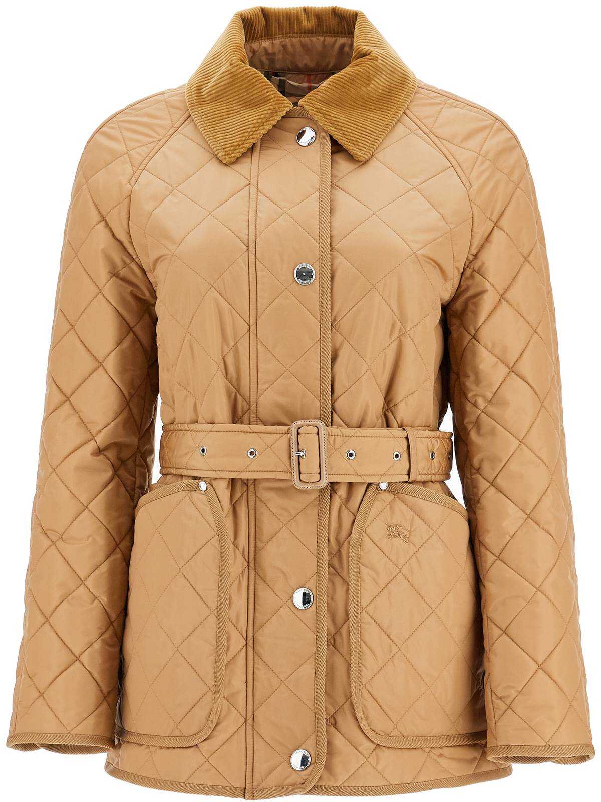 The Burberry jacket in quilted nylon with corduroy collar and adjustable, removable belt. Featuring a straight cut with raglan sleeves and hip-length, it has a two-way zip and snap button closure, patch pockets with embroidered EKD detail, snap buttons on the cuffs and back slits, tartan lining and an inner pocket. Light polyester padding. The model is 177 cm tall and wears size S.
