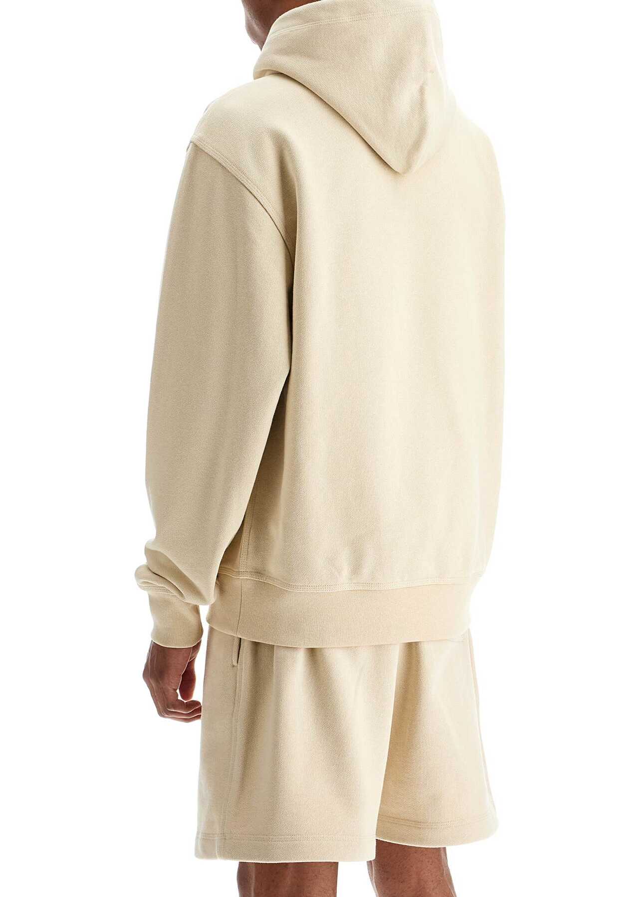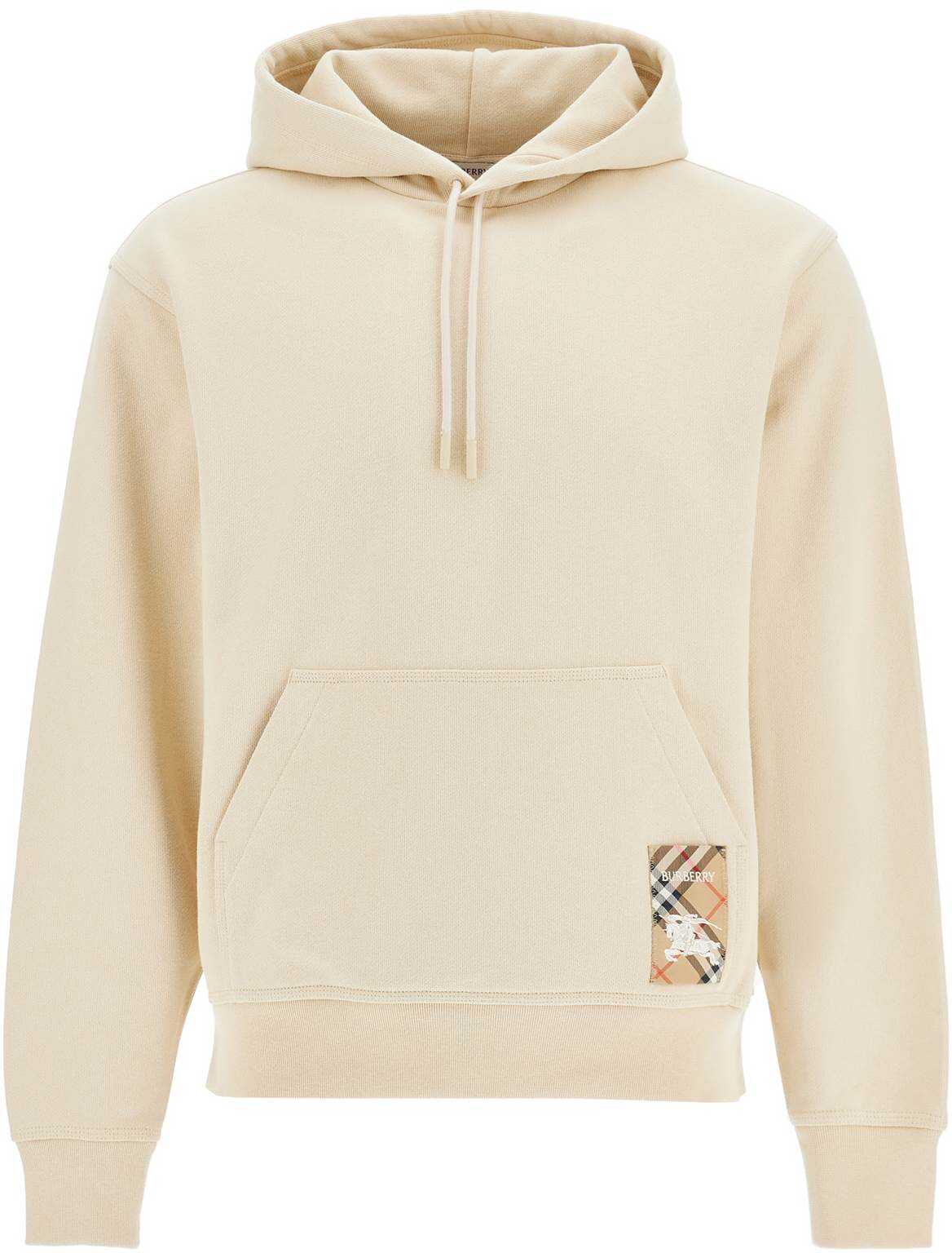 This loose Burberry sweatshirt is made of organic cotton jersey and finished with a Check label on the bottom. It features a drawstring hood, ribbed edges, and a front kangaroo pocket. The model is 182 cm tall and wears size M.