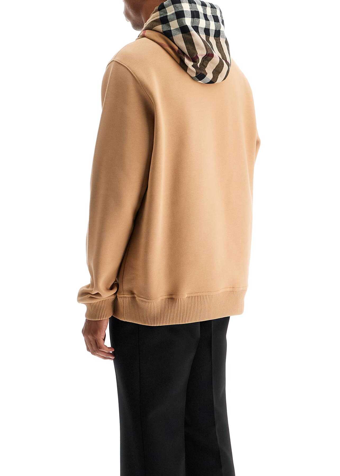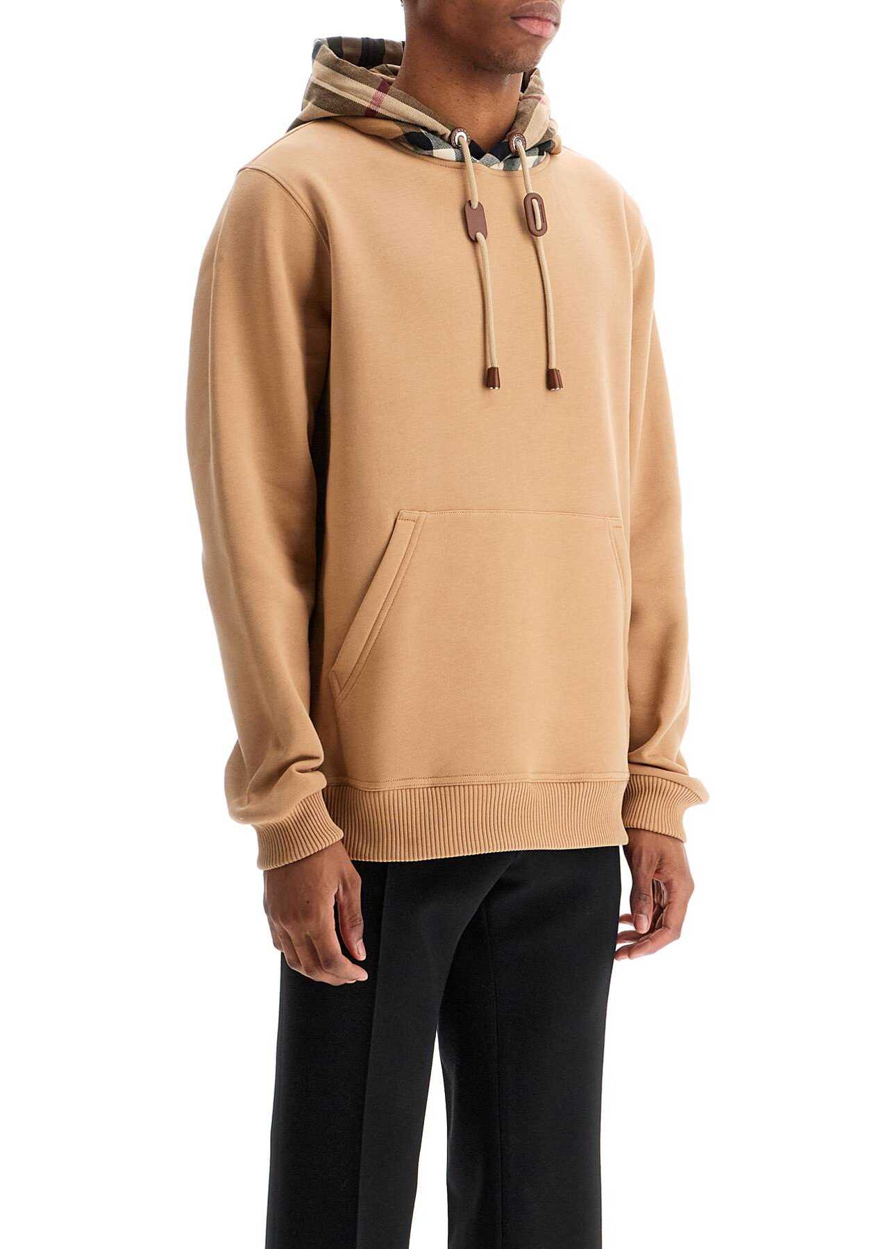 Classic Burberry sweatshirt made of cotton blend jersey with a soft fleece interior, featuring a tartan flannel hood with a leather-trimmed drawstring. Loose fit with a front kangaroo pocket and ribbed edges. The model is 182 cm tall and wears size M.