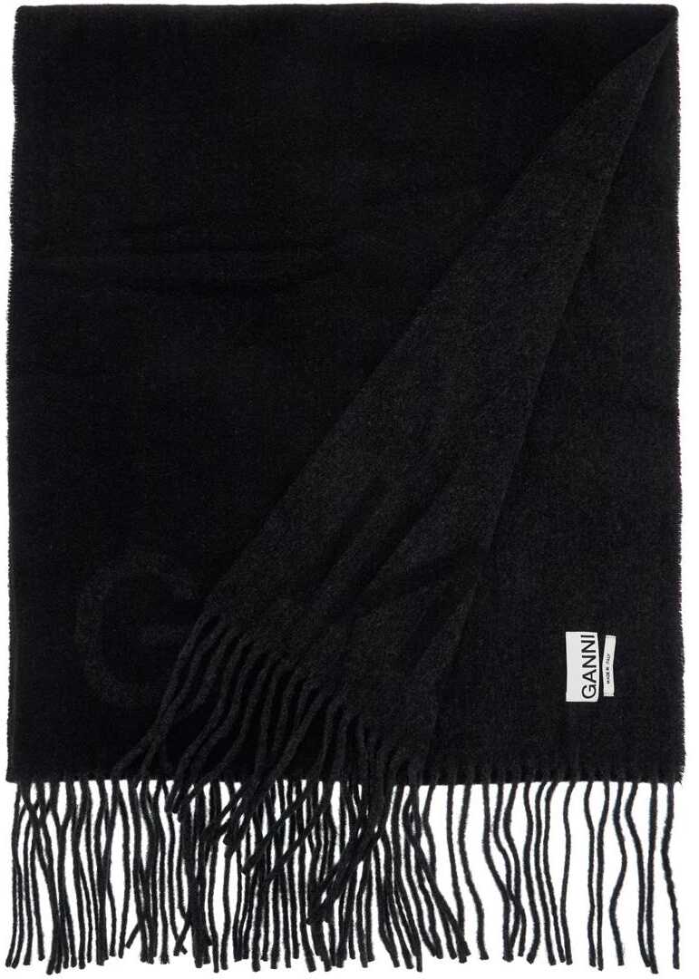 Ganni scarf crafted in recycled-wool blend with jacquard logo lettering, finished with fringed edges.