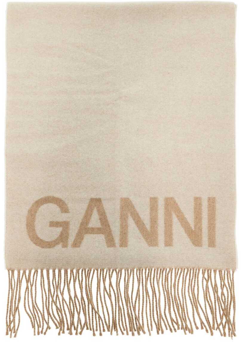 Ganni scarf crafted in recycled-wool blend with jacquard logo lettering, finished with fringed edges.