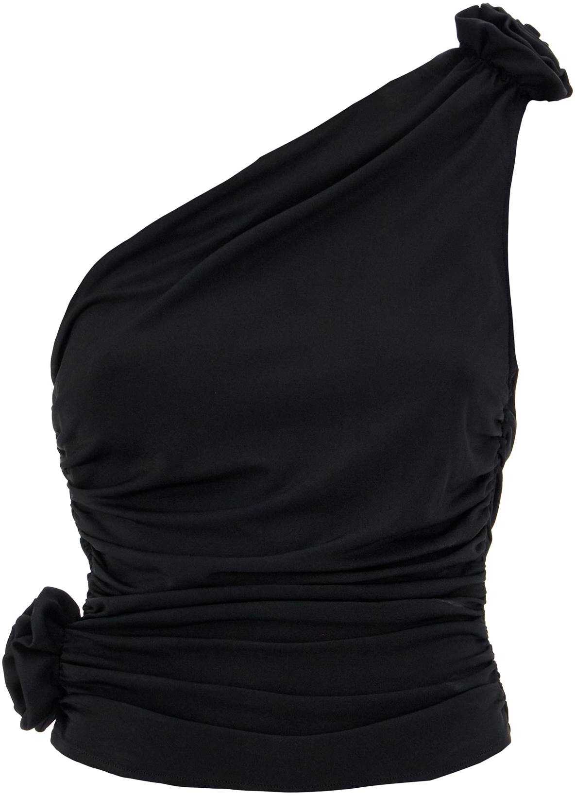This Magda Butrym one-shoulder top is adorned with fabric flower appliques. Made from viscose jersey, it features ruched construction along the sides and a fitted silhouette. The model is 177 cm tall and wears a size FR 36.