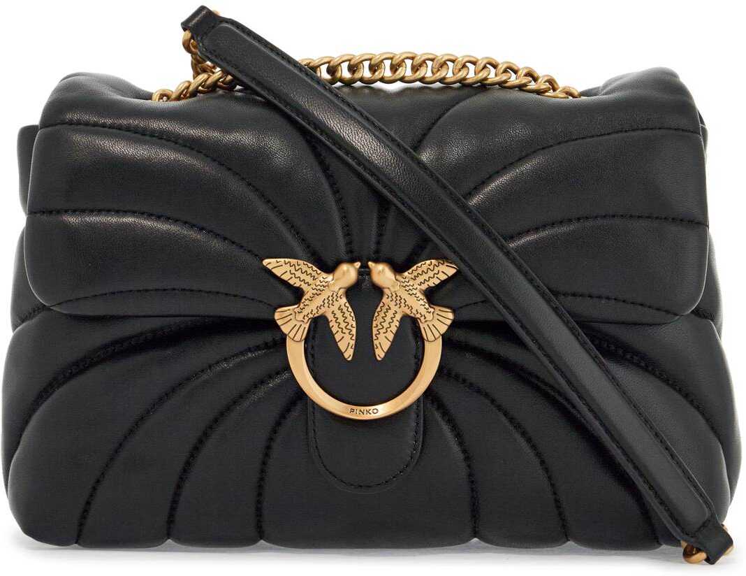 The Pinko Love Classic Puff Butterfly Quilt bag is made of soft nappa leather with a semi-circular quilted pattern that converges towards the iconic metal buckle featuring the Love Birds logo. It can be worn as a handbag, shoulder bag or crossbody thanks to the chain strap with sliding leather insert and double handle. The bag has a snap closure and embroidered Birds design on the back. The interior is lined with microfiber and features a flat leather pocket and two compartments separated by