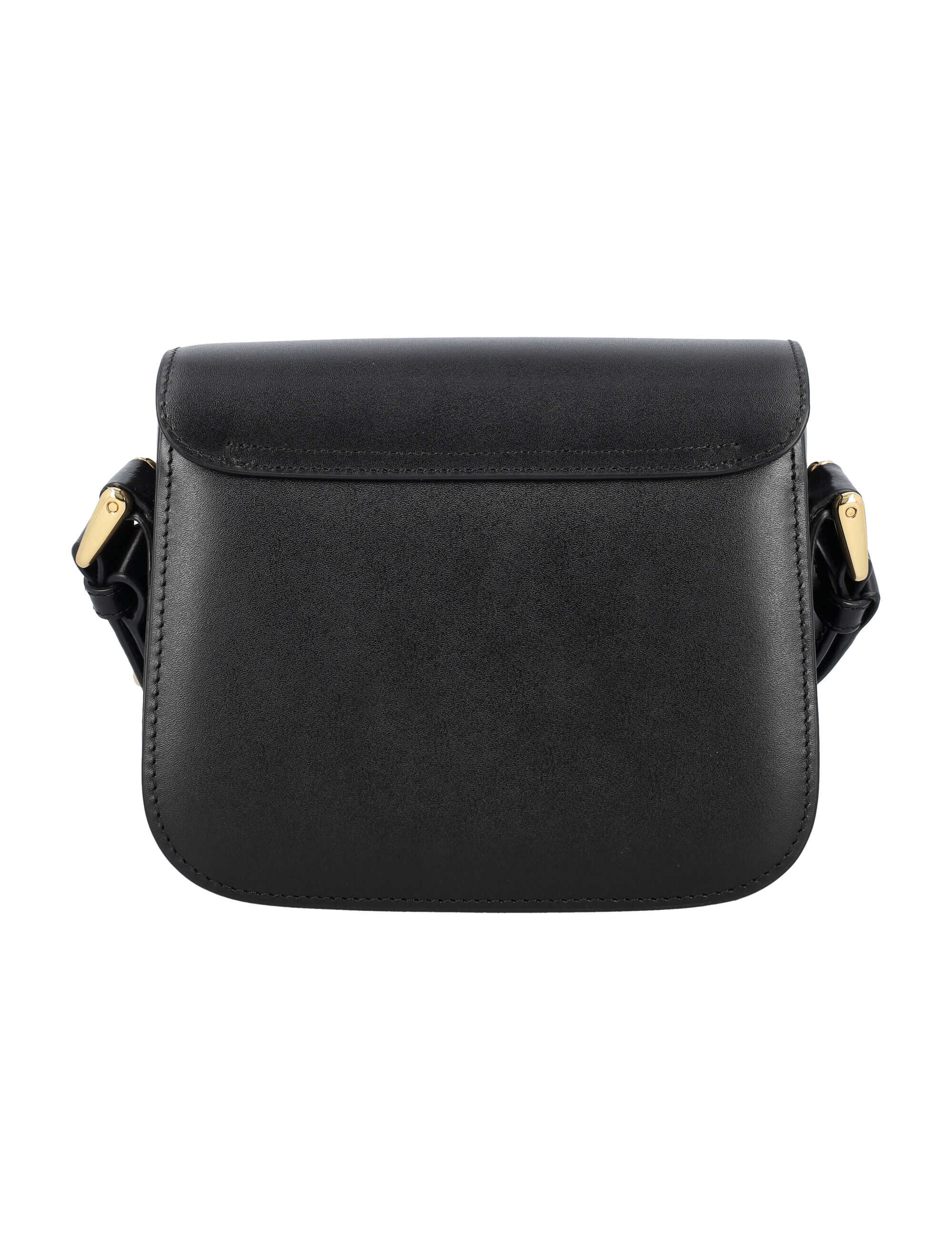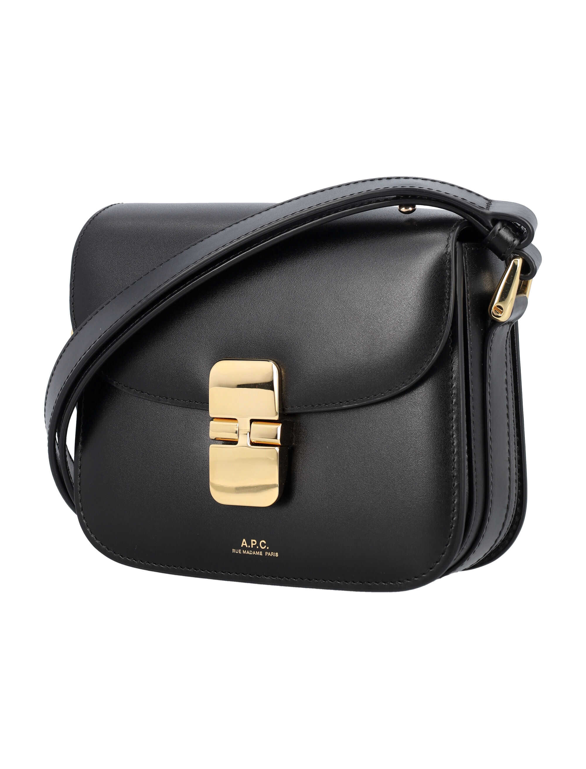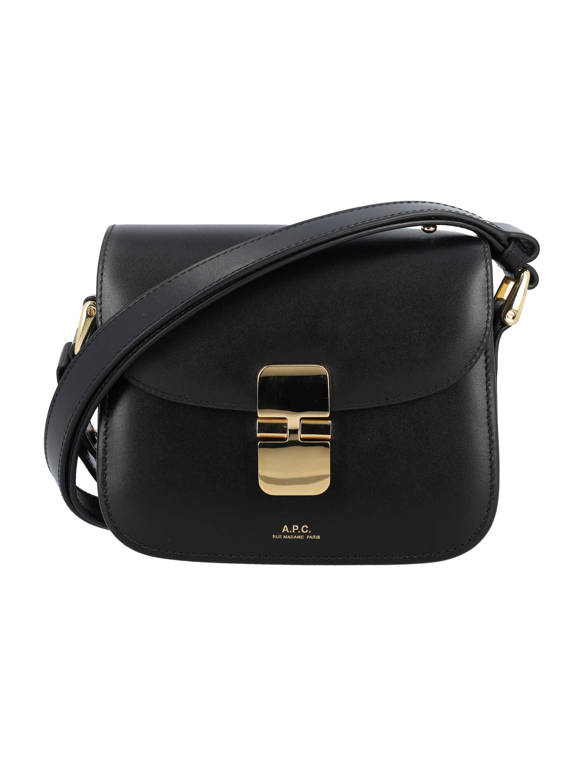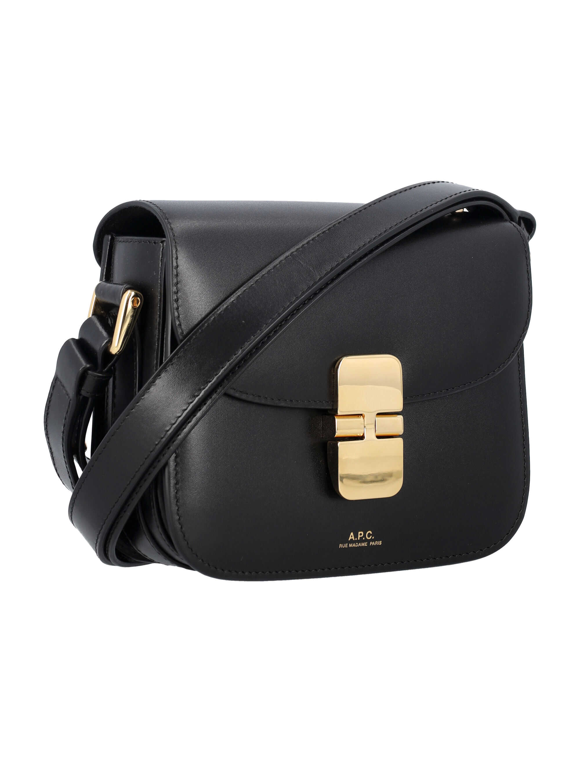 The A.P.C. Grace mini bag is the perfect accessory for any outfit. Made of 100% cow leather, this black bag adds a touch of sophistication to any look. With a clasp flap closure, adjustable shoulder strap, and multiple compartments, it's both stylish and practical. The goldtone hardware and 'A.P.C. rue Madame Paris' logo embossed on the front add a touch of luxury. Measures 14.5cm x 17.5cm x 4cm.