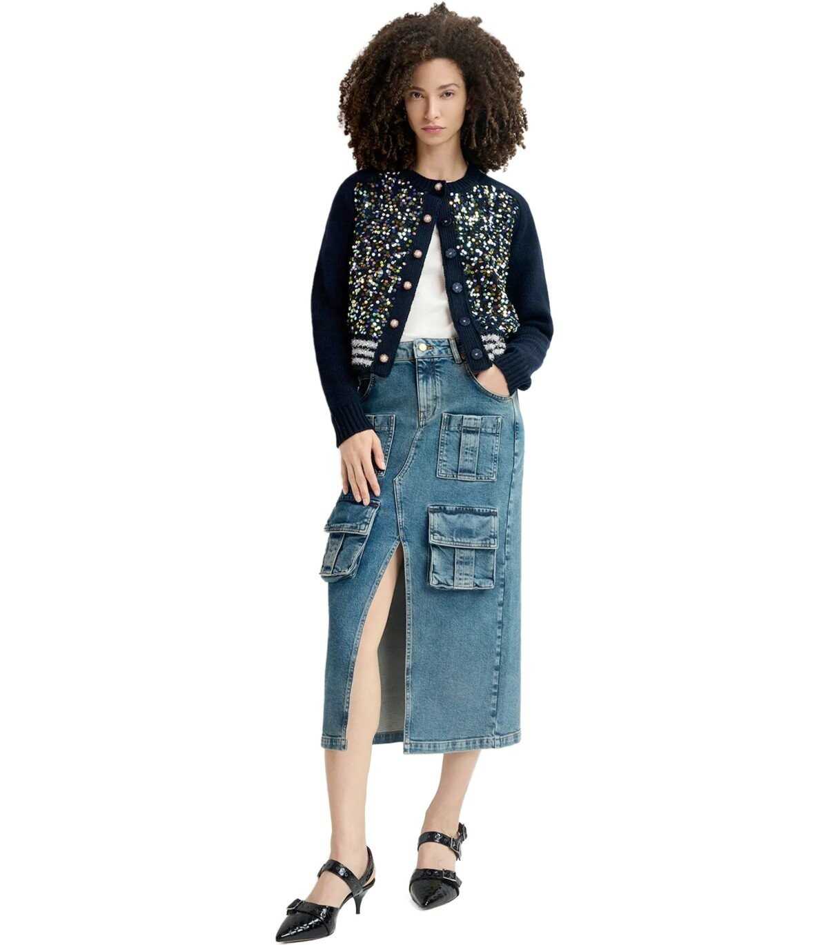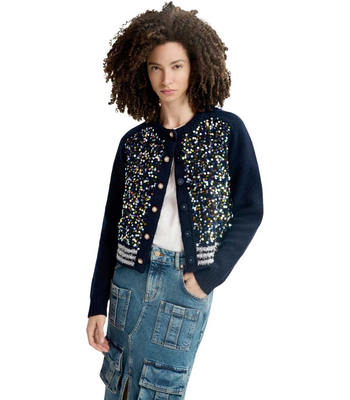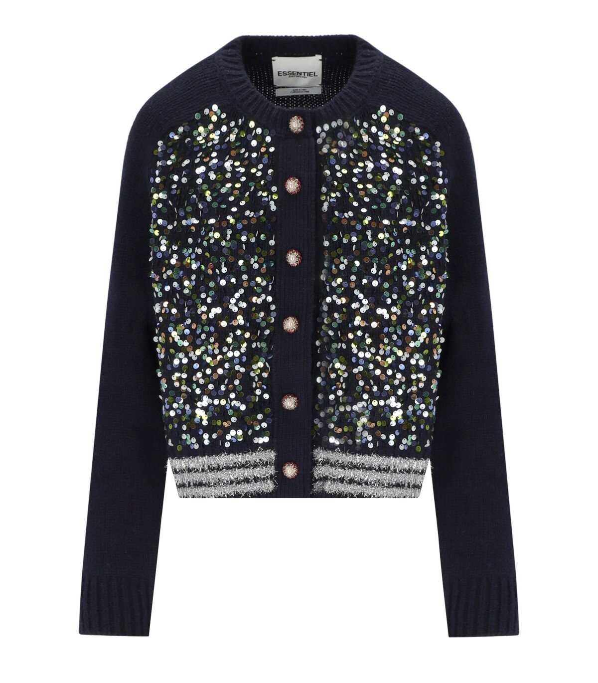 Essentiel Antwerp Halter Cardigan, made of a wool blend, in dark blue, green, and silver tones. Adorned on the front with shimmering sequins, it features a button closure embellished with pearls and rhinestones. Finished with ribbed edges, it has a decorative ribbon at the waist that adds a touch of style, accentuating the silhouette. Relaxed fit.