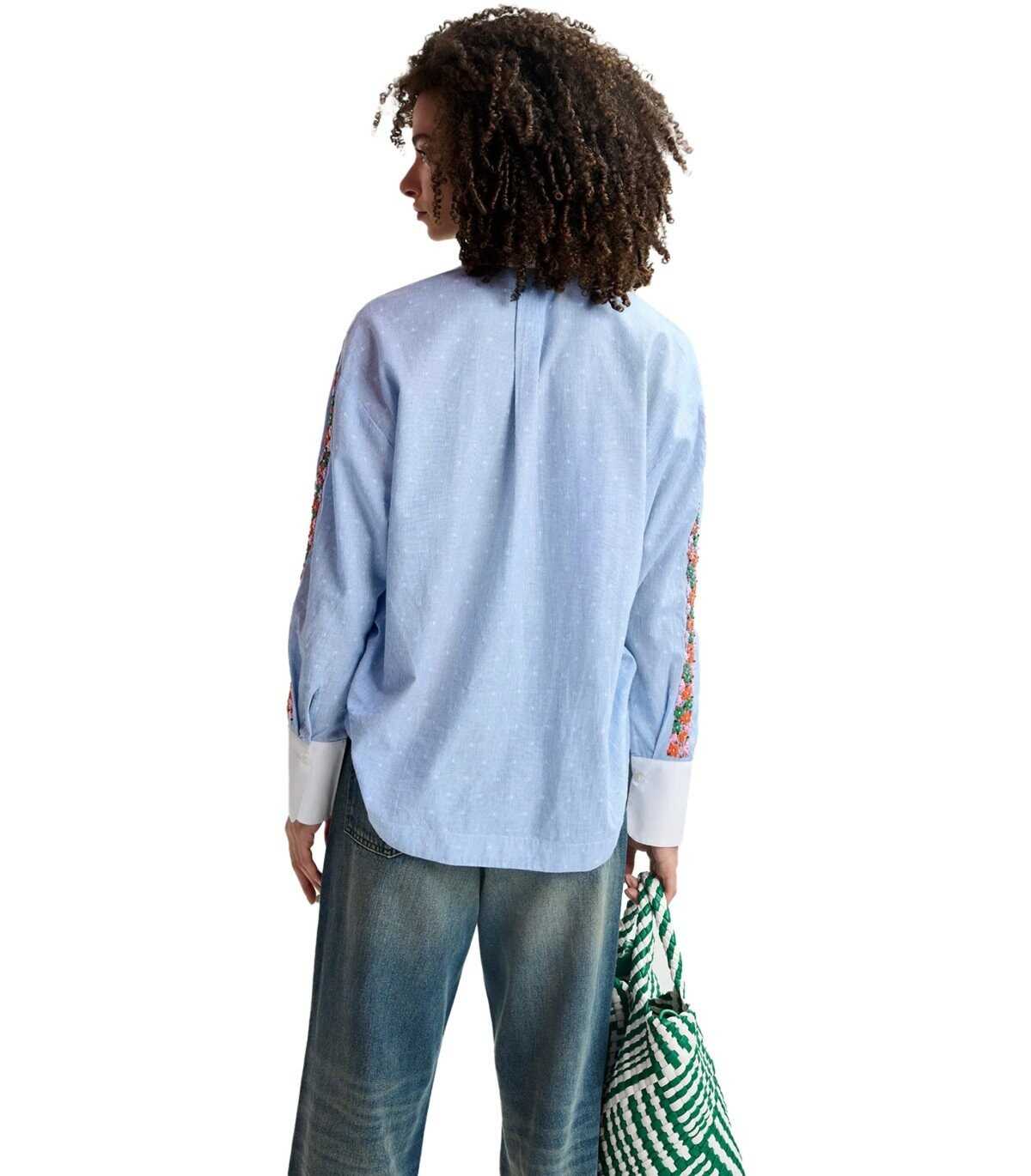 Harkle shirt by Essentiel Antwerp, made of cotton poplin, in shades of blue and white. Characterized by lightweight and non-stretch fabric, it features a button closure. Finished with embroidered details and flower-shaped beads along the long sleeves, it has dropped shoulders and a chest pocket. Equipped with a pointed preppy collar and classic cuffs with button closure. Rounded hem and longer hem at the back. Oversized fit.