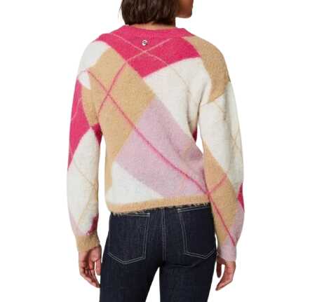 Questa Maglia collezione Actitude Di Twinset in misto lana jacquard a disegno geometrico al tatto soffice e vellutata. Presenta girocollo, con profili rifiniti a costine, le maniche lunghe, il logo in metallo sul retro, la linea morbida.