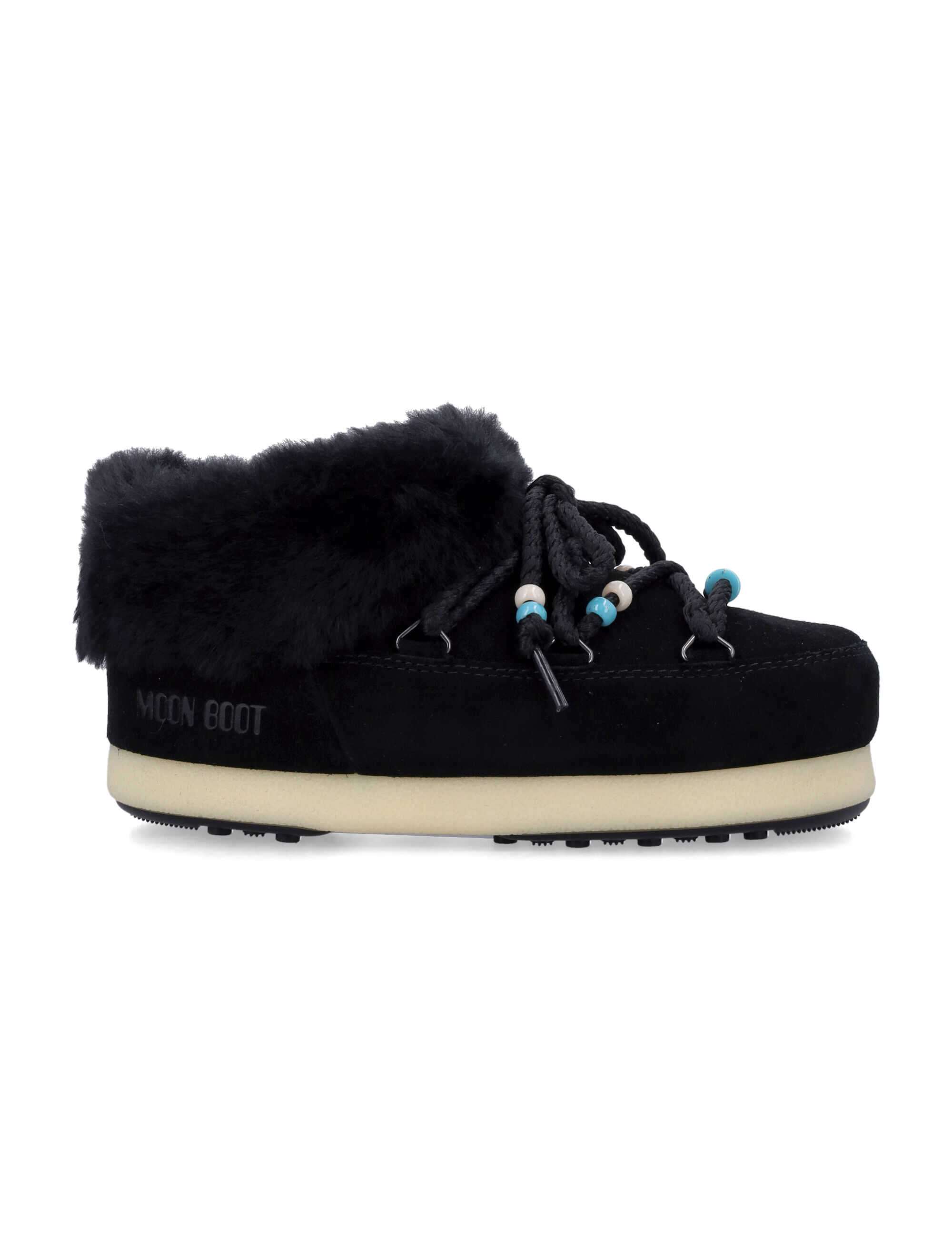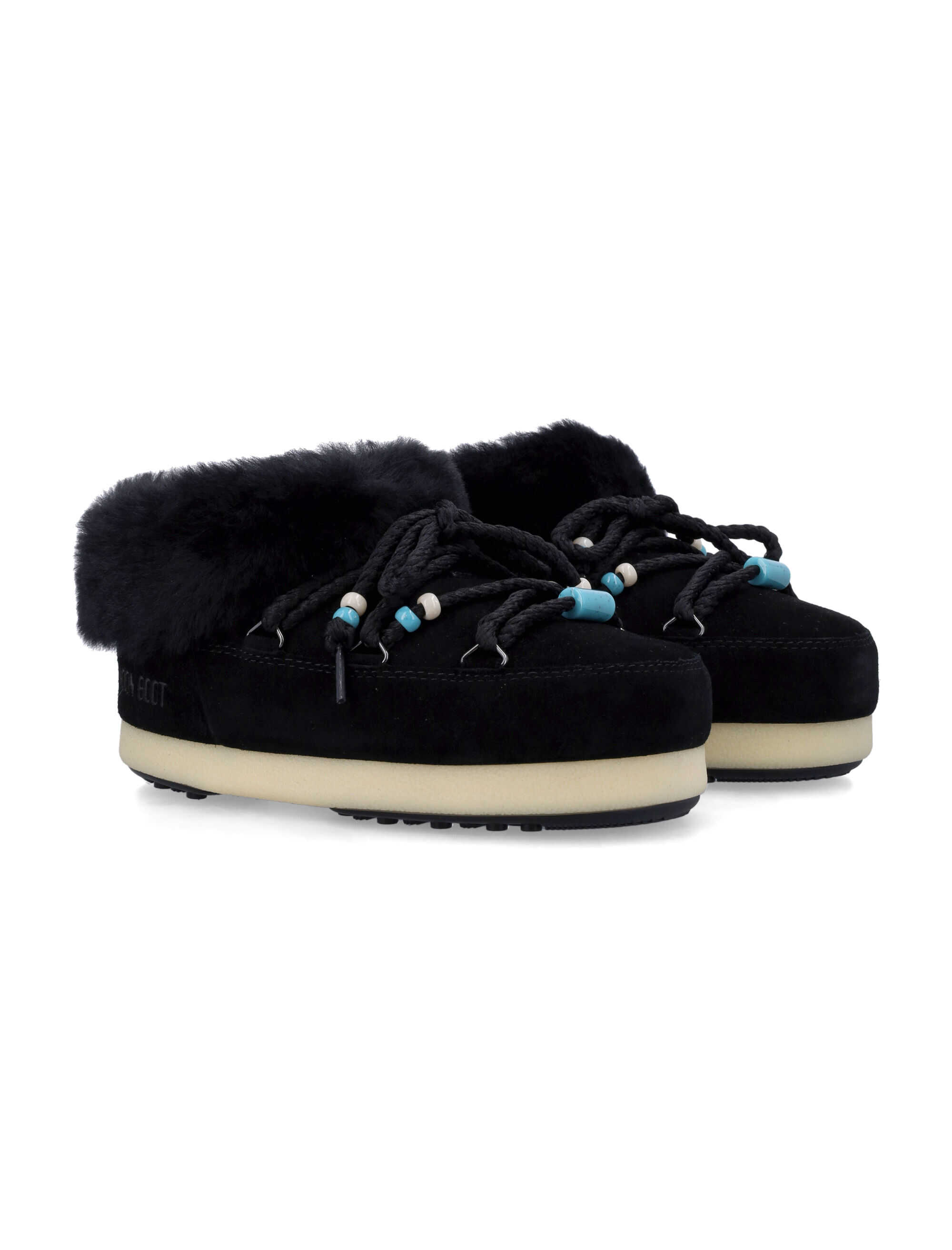 Experience unmatched comfort and style with the MB EVX mule by Moon Boot. Crafted with a luxurious suede leather upper and adorned with bead-embellished laces, it features a cozy shearling collar and durable rubber sole for everyday elegance.