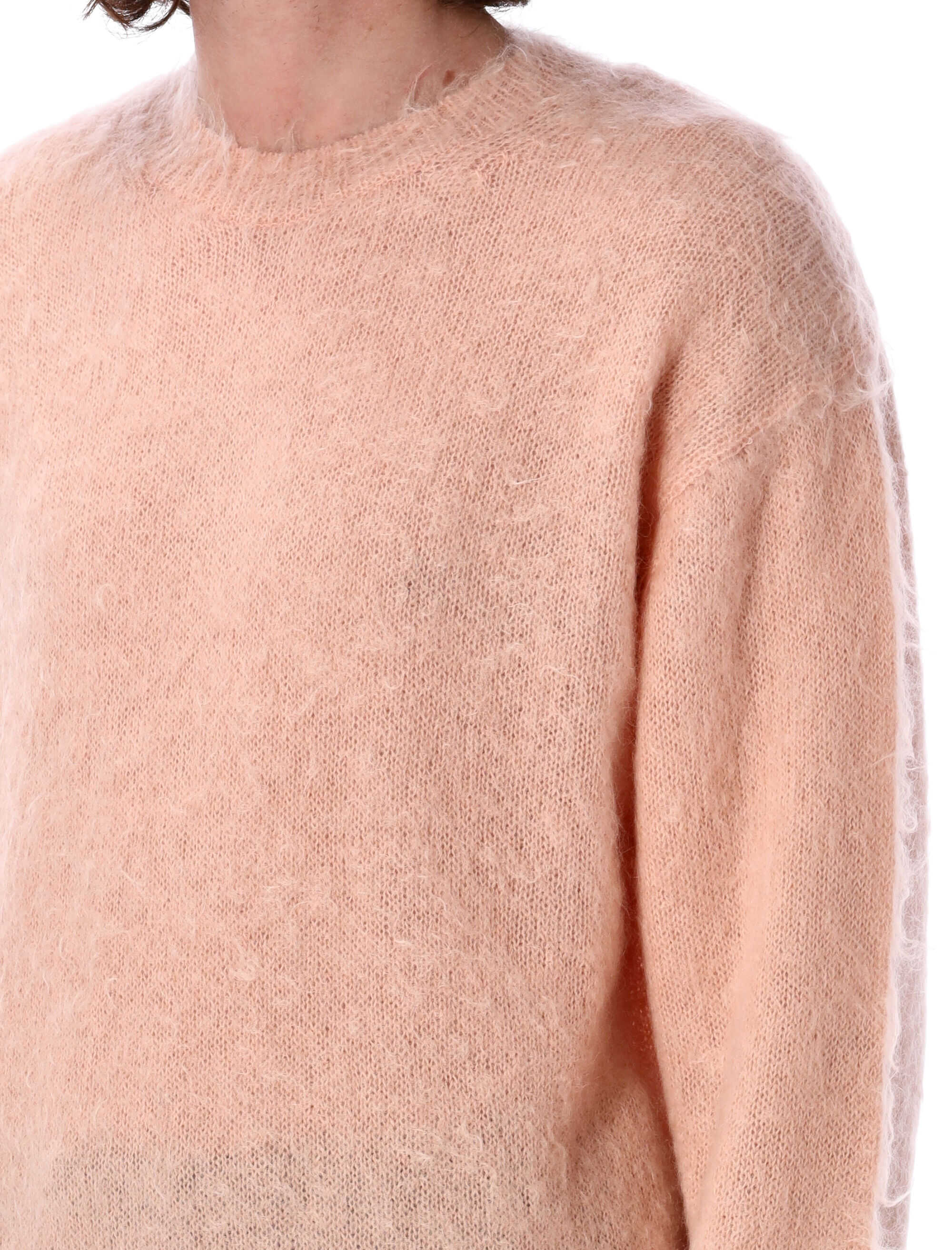 Elevate your wardrobe with this Brushed Super Kid Mohair Knit Sweater. Crafted from a luxurious blend of kid mohair and wool, it features a relaxed fit, crew neck, and stylish dropped shoulders, making it the perfect piece for effortless elegance.
