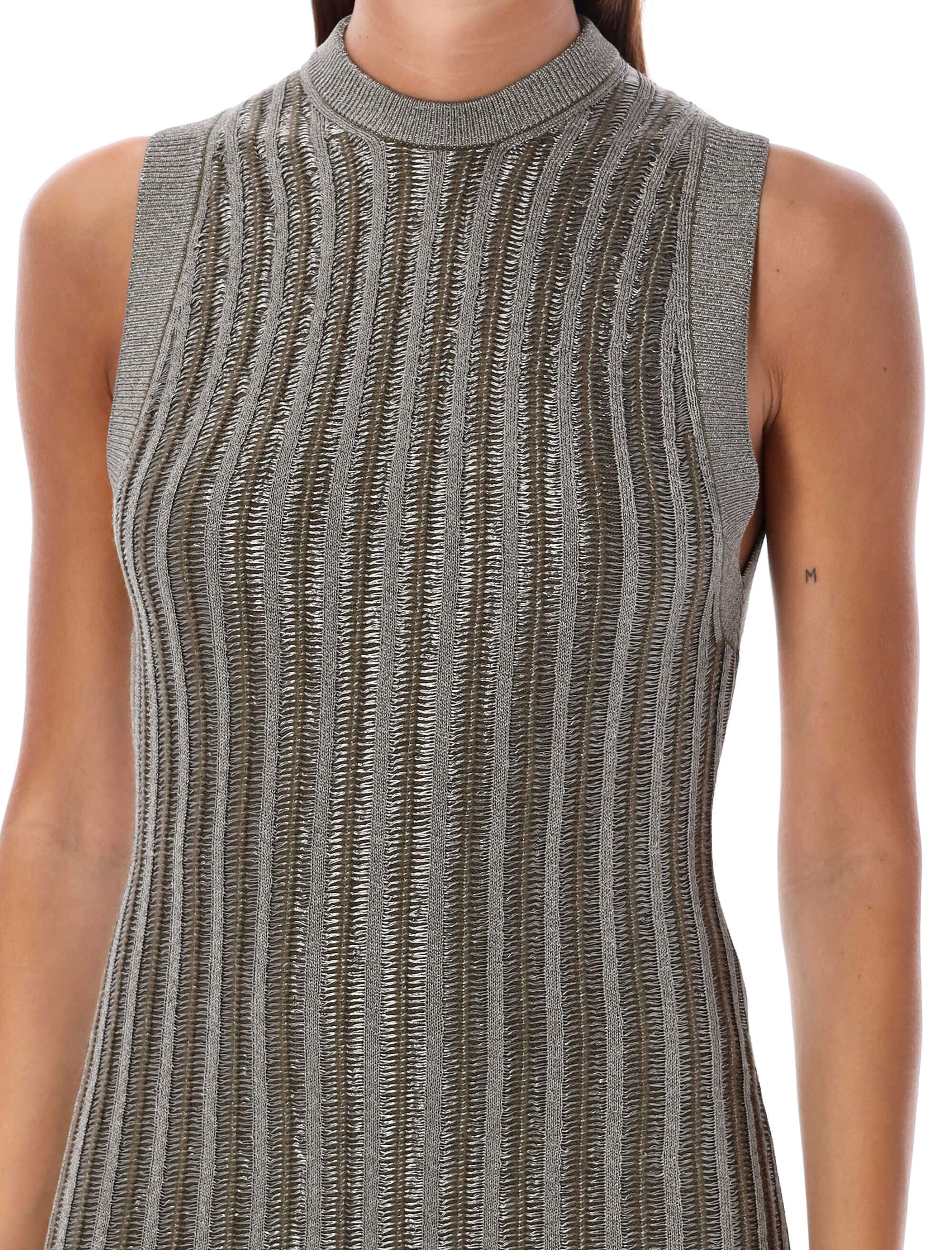 Make a statement in this stunning Metallic Olive long dress by Tom Ford. Crafted from a luxurious blend of virgin wool, viscose, and lurex, this dress features a slinky metallic rib design with a crewneck, ribbed neckline and armholes, and an invisible zip. Perfect for a special occasion or a night out on the town. Stand out from the crowd and turn heads wherever you go!