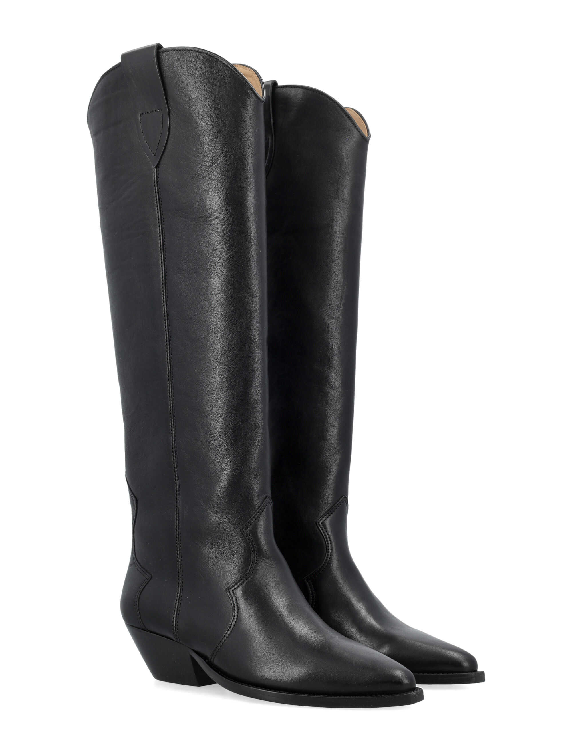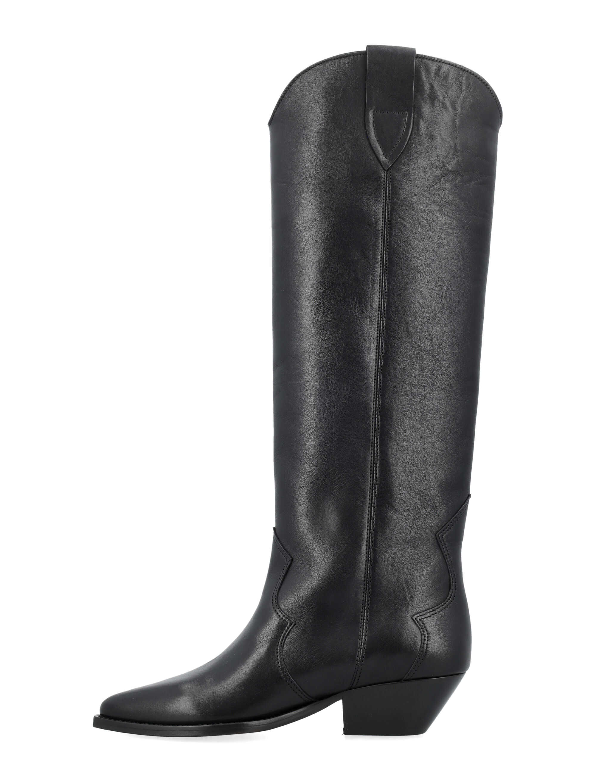 Step out in style with these striking Denvee boots by Isabel Marant. Crafted from premium calf skin leather, these knee-high boots feature a classic cowboy design with a pointed toe and low stacked heel. Easy to pull on and featuring stylish tonal stitching details, these boots are a must-have for any fashion-forward woman. Elevate your look with the timeless elegance of Isabel Marant.
