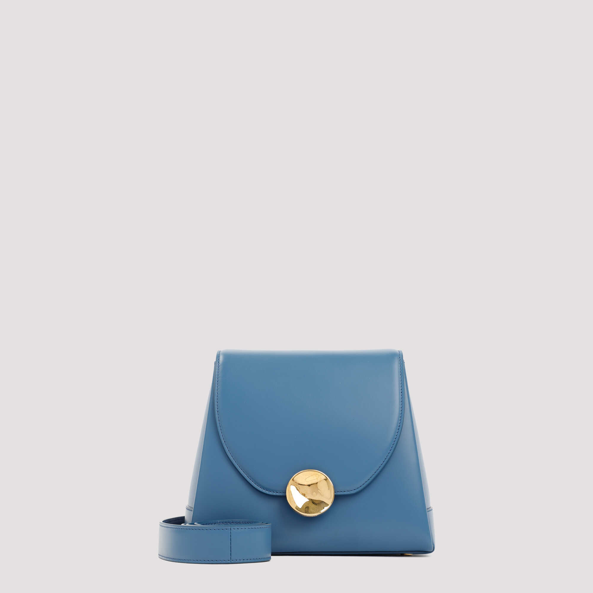 Jim Sander Deep Blue Leather Victor Md Bag. Crafted in pure Deep Blue, Detachable leather strap, trapezoid shape, flap closure with golden metal round detail. Fully lined.