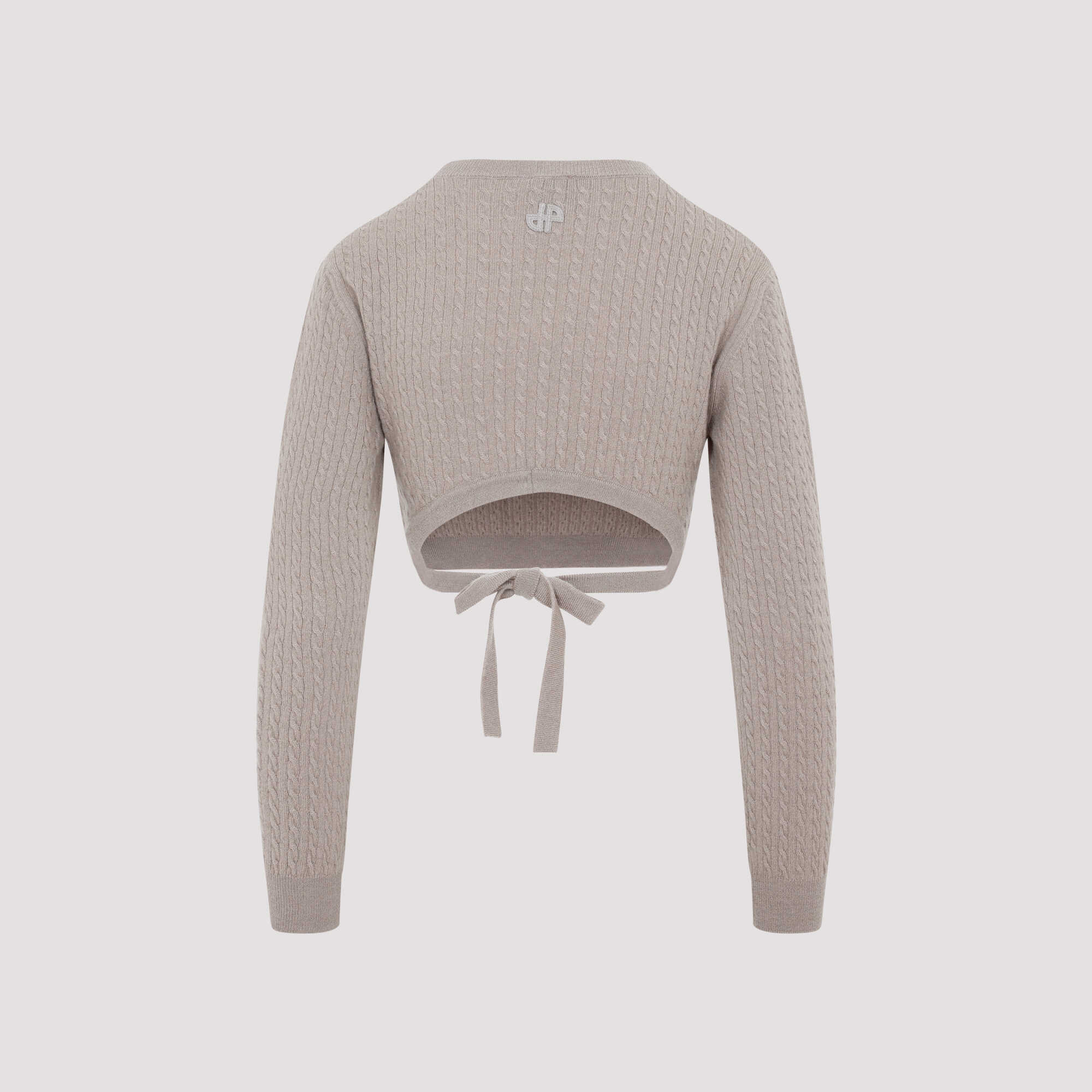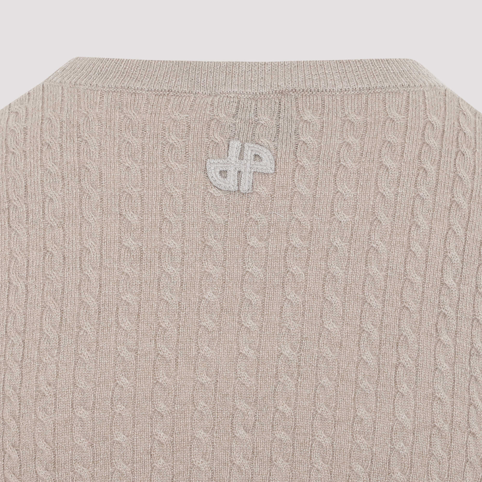 Elevate your style with this luxurious Patou taupe curve link cropped jumper. Made from a blend of wool and cashmere, featuring a crewneck, long sleeves, subtle cable-knit design, and an open back with a self-tie belt for a chic touch. Perfect for adding a touch of sophistication to your wardrobe. Shop now!