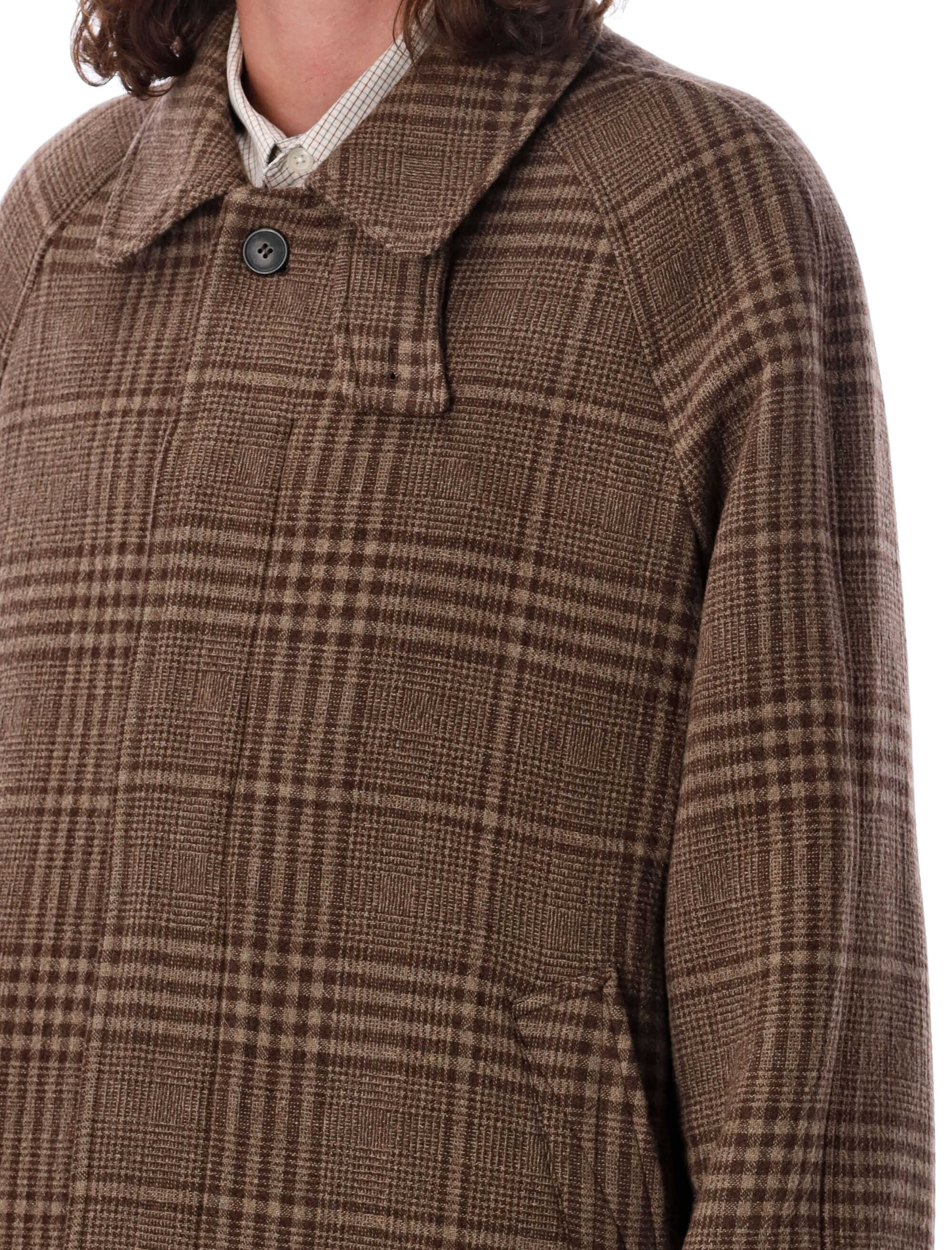Elevate your outerwear with the Accession coat by Mfpen. Crafted from 100% recycled wool, it features a stylish brown check pattern, oversized fit, and practical details like large pockets and adjustable cuffs. Perfect for a chic, sustainable wardrobe.