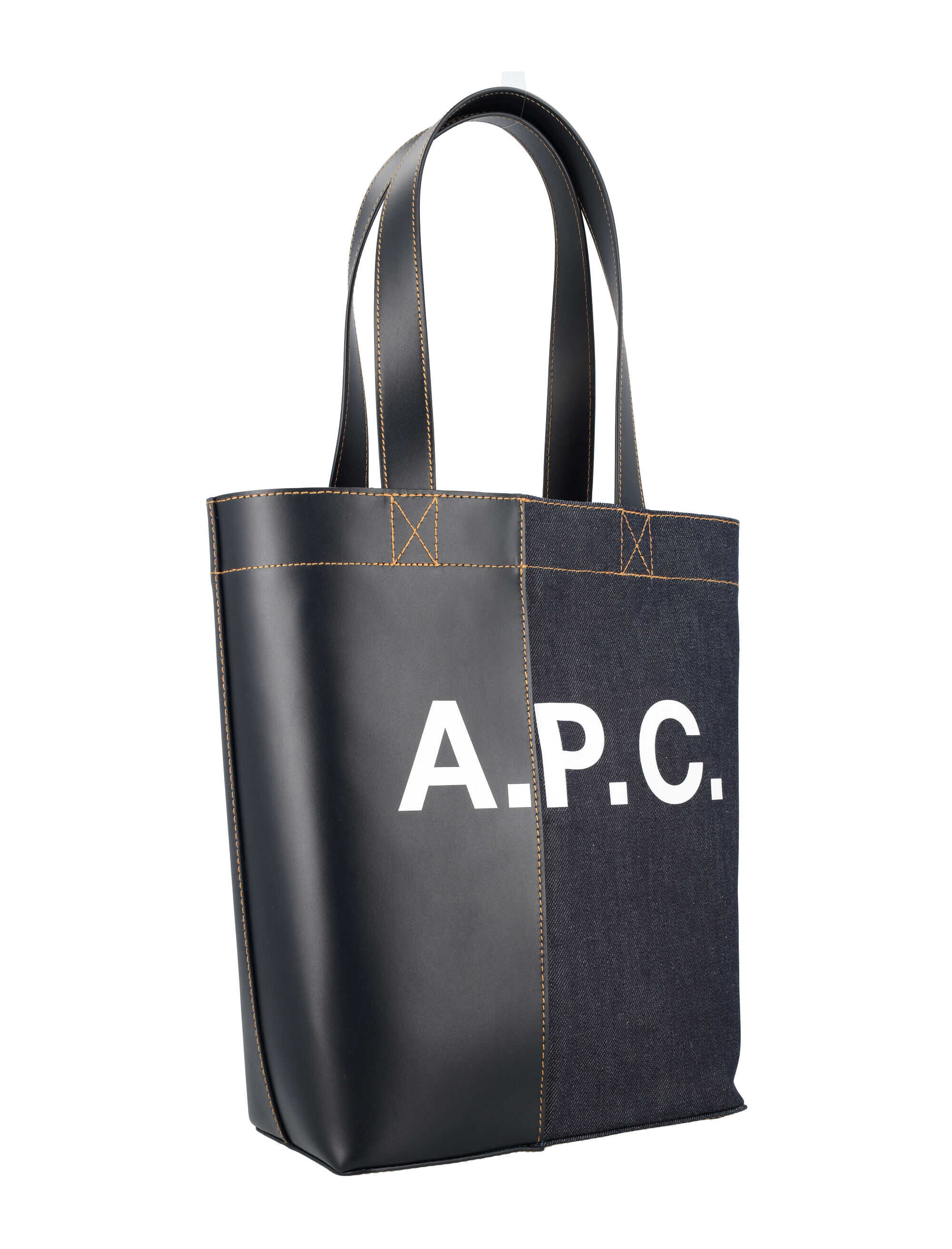 Upgrade your style with the luxurious Axel N/S tote bag in Dark Navy by A.P.C. Crafted from a blend of cotton, polyurethane, and cowhide, this handbag features top handles, a wide leather band on the bottom, logo print, and an interior zip pocket. Perfect for everyday use. Height: 35 cm, Width: 30 cm, Depth: 12 cm.