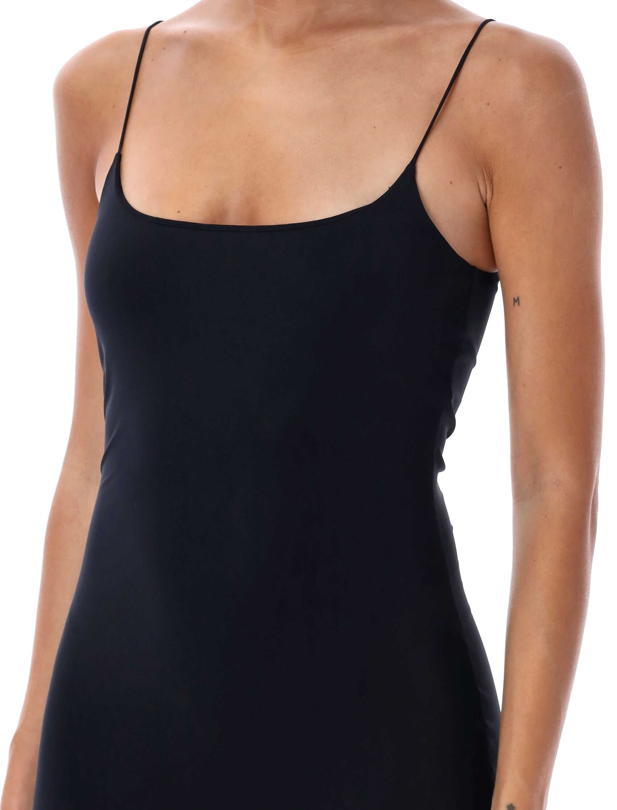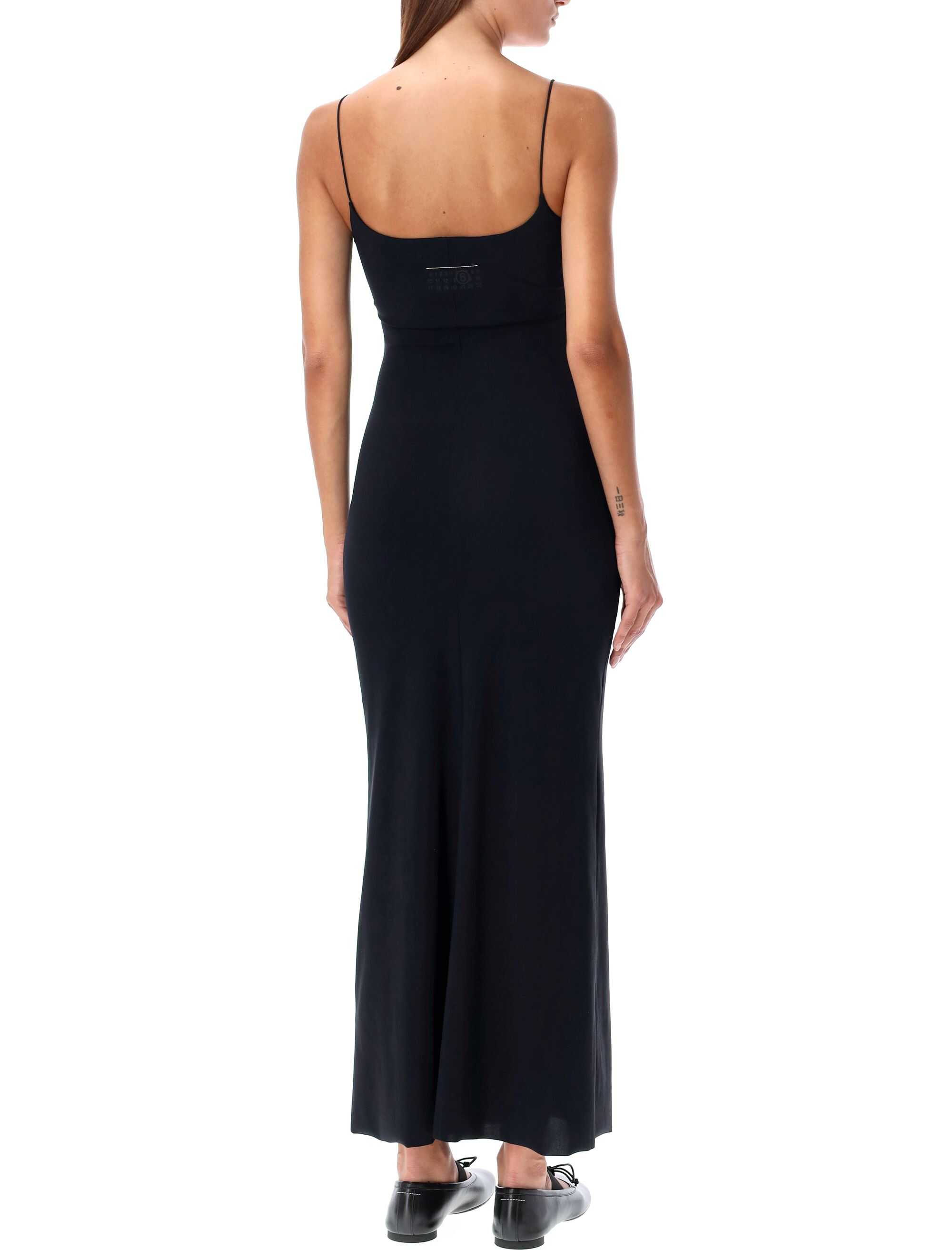 Elevate your style with this sophisticated black Jersey midi dress from MM6 Maison Margela. Made from a blend of 78% polyamide and 22% elastane, this dress features a slim fit, square neckline, spaghetti straps, and a seamless back design. Perfect for any occasion, the subtle MM6 Maison Margiela logo detail adds a touch of luxury. Make a statement and stand out in this stunning piece. Order yours now!