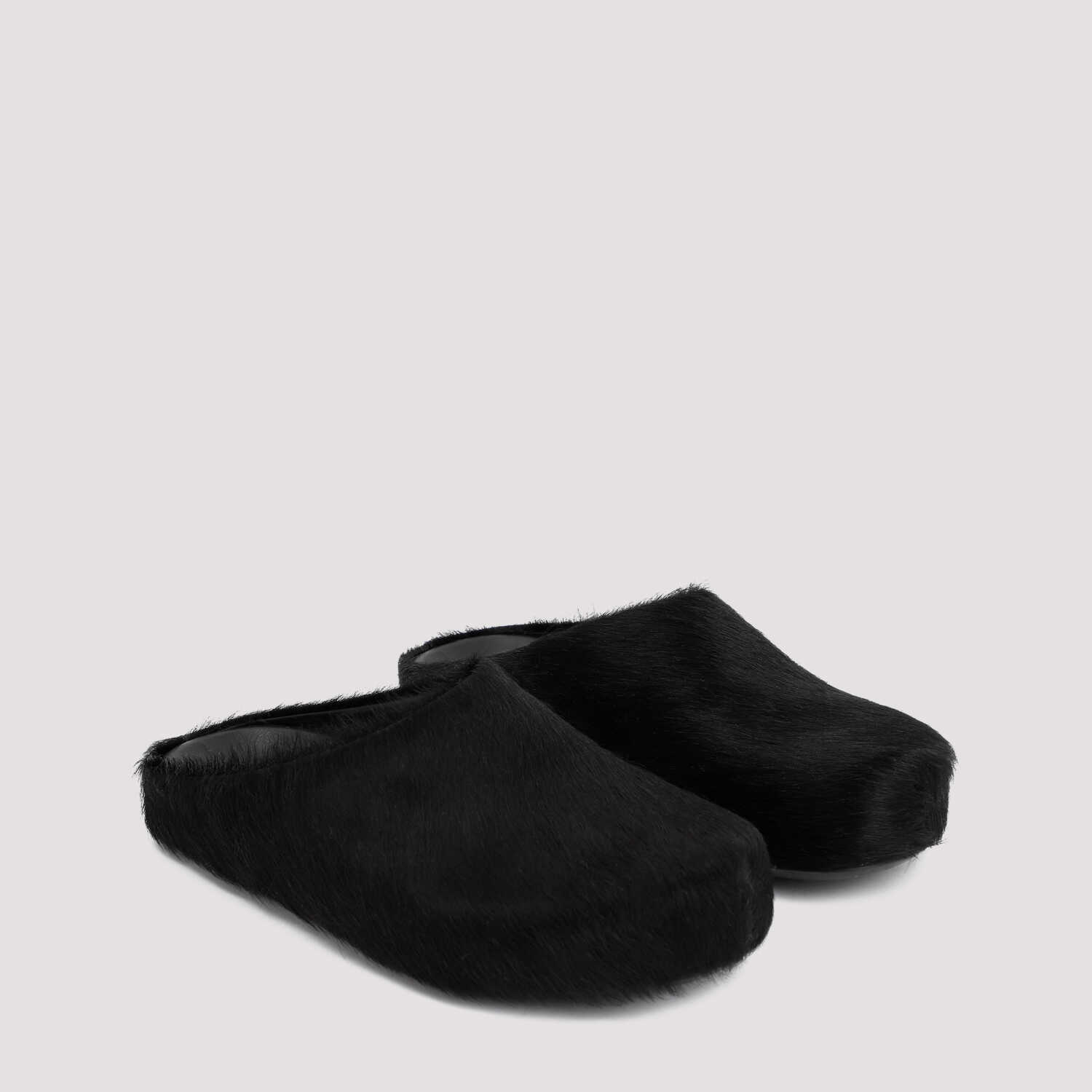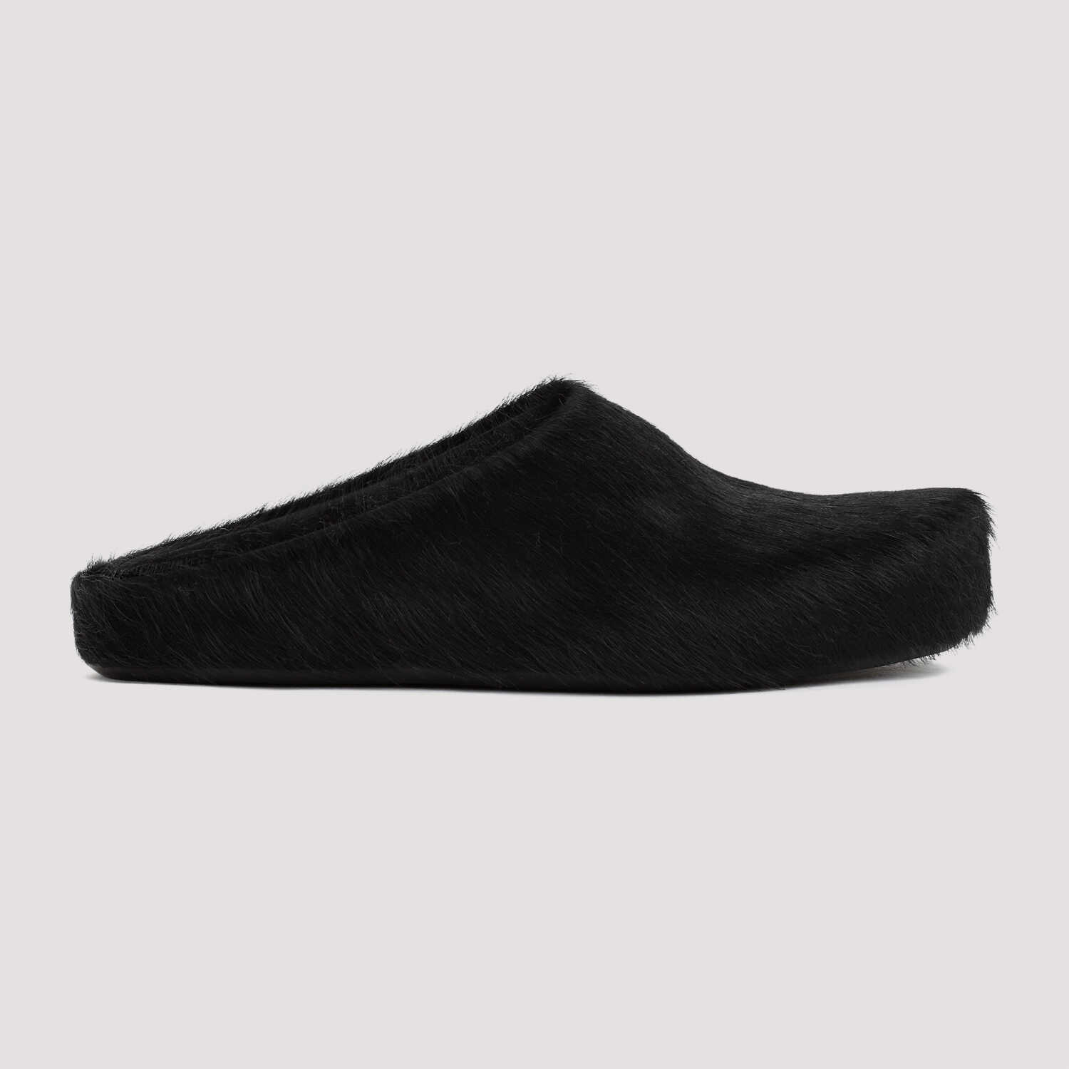 Marni Black Fussbett Sabot Mules. Black Calf Hair Upper, round toeline, Rubber Outsole and Leather Footbed. Rubber sole.