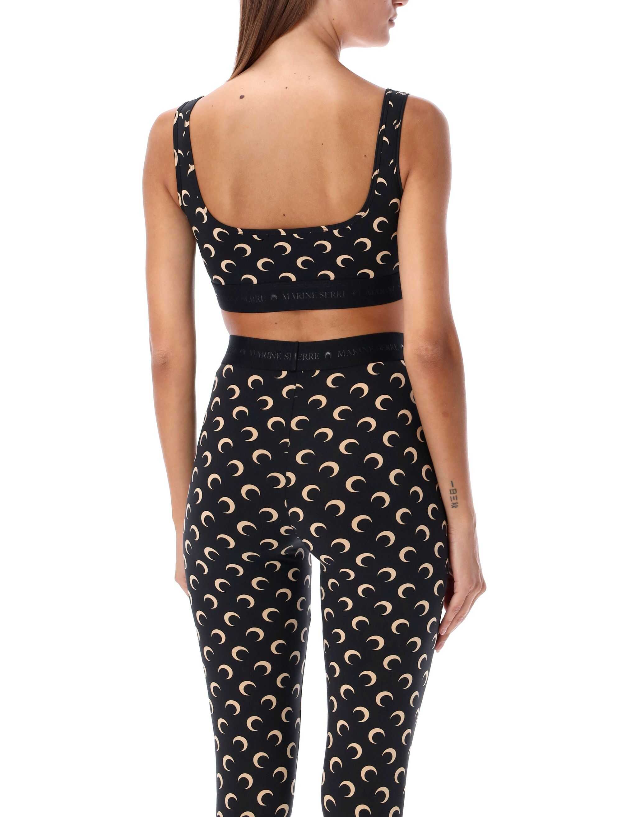 Achieve ultimate comfort and style with the Moon sport bra by Marine Serre. Made with stretchy, form-fitting fabric and featuring the iconic moon print, square neckline, and sleeveless design. The elasticated underband provides extra support. Perfect for workouts or everyday wear. Get yours today and elevate your activewear collection!