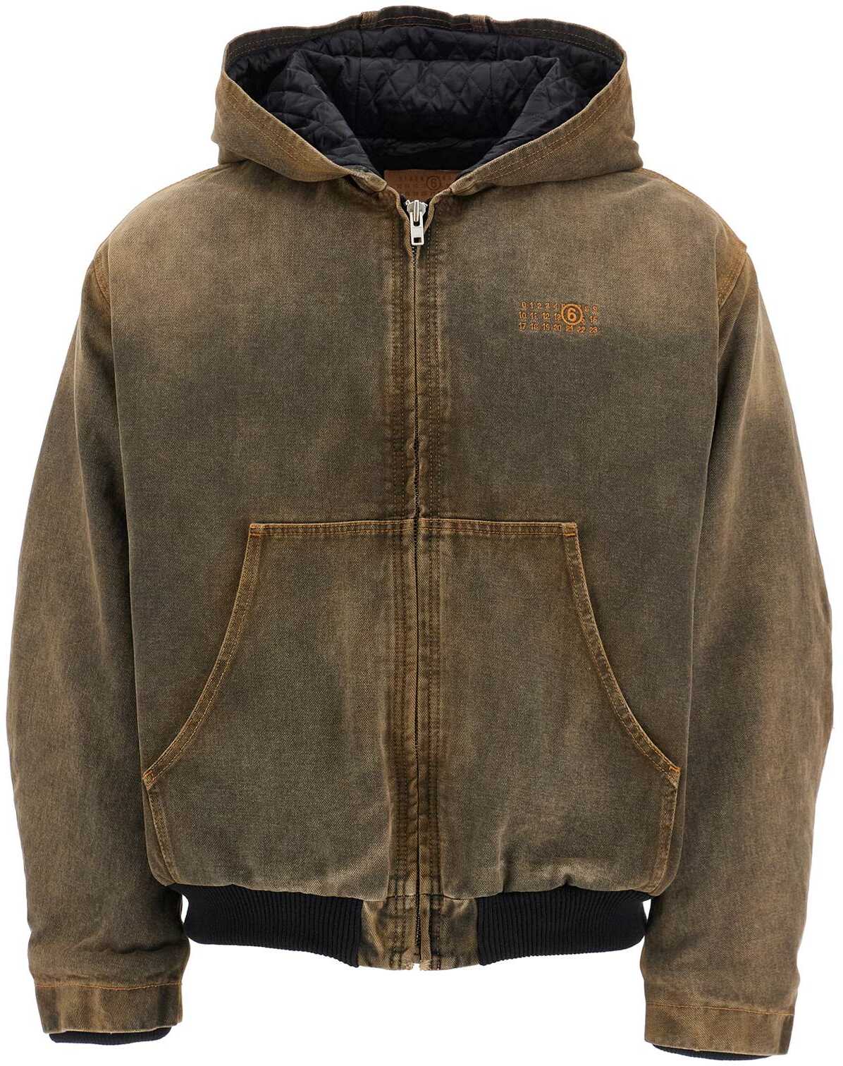 The MM6 Maison Margiela Bomber is made of pure cotton denim with a washed effect and finished with ribbed edges and contrasting stitching. The hood, zip closure, and divided kangaroo pocket offer practicality, while the embroidered numeric signature on the chest and white seam on the back highlight the brand's signature. The versatile design also features underarm openings for an alternative look. Technical padding and quilted lining provide warmth. The model is 182 cm tall and wears size IT 48