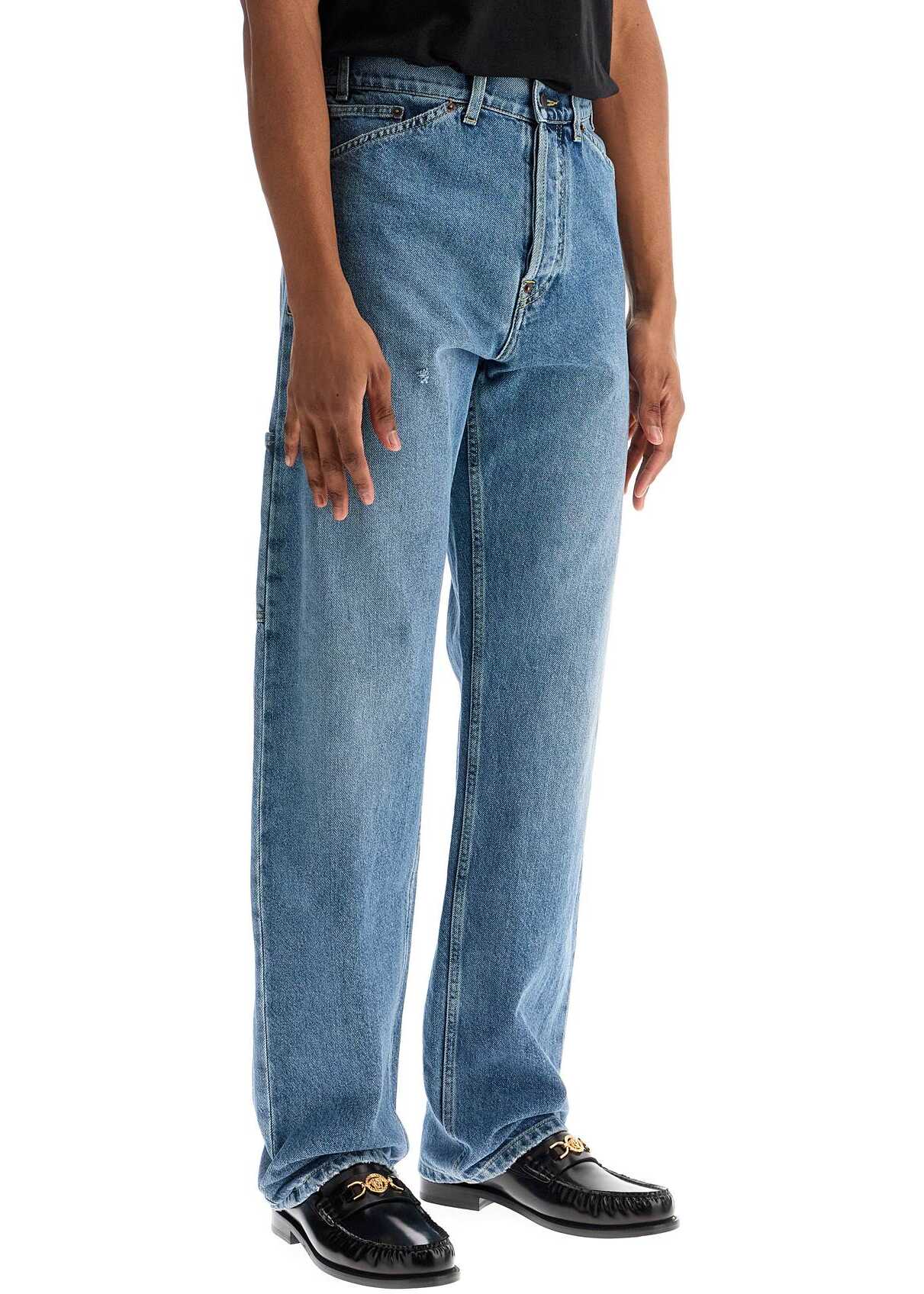 Moschino five-pocket jeans in lightweight denim with a distressed wash, featuring a straight cut and medium-rise waist adjustable through buttons on the sides. Belt loops, button fly, and a utility pocket on the right leg complete the design. The model is 177 cm tall and wears size IT 48.