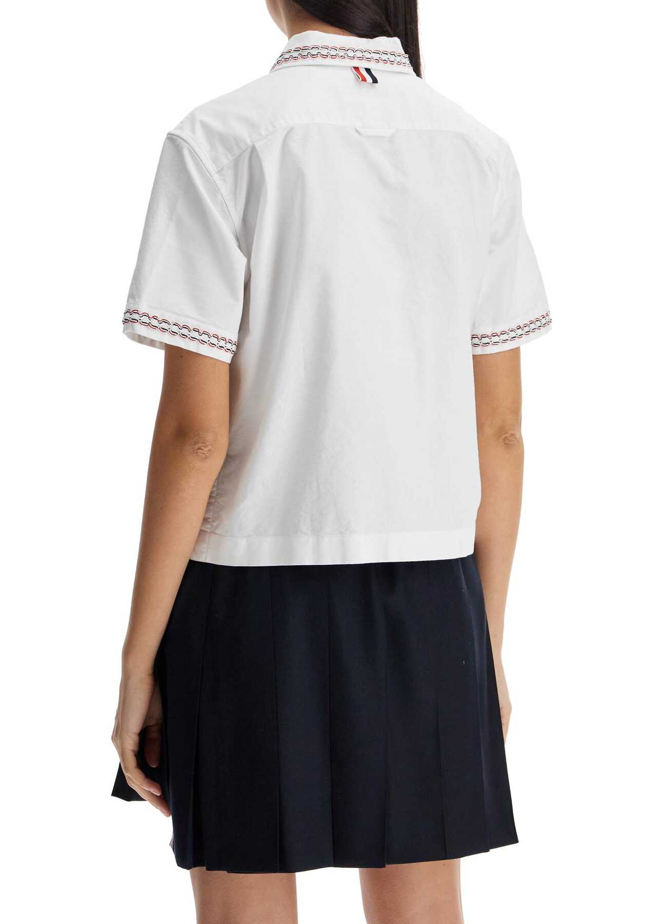 Thom Browne's cropped shirt is made of cotton Oxford and features the iconic tricolor ribbon on the edges, here in a ruffled version. It has a classic collar, front button closure, side slits, and an asymmetrical hemline. The fit is boxy. The model is 177 cm tall and wears size IT 40.