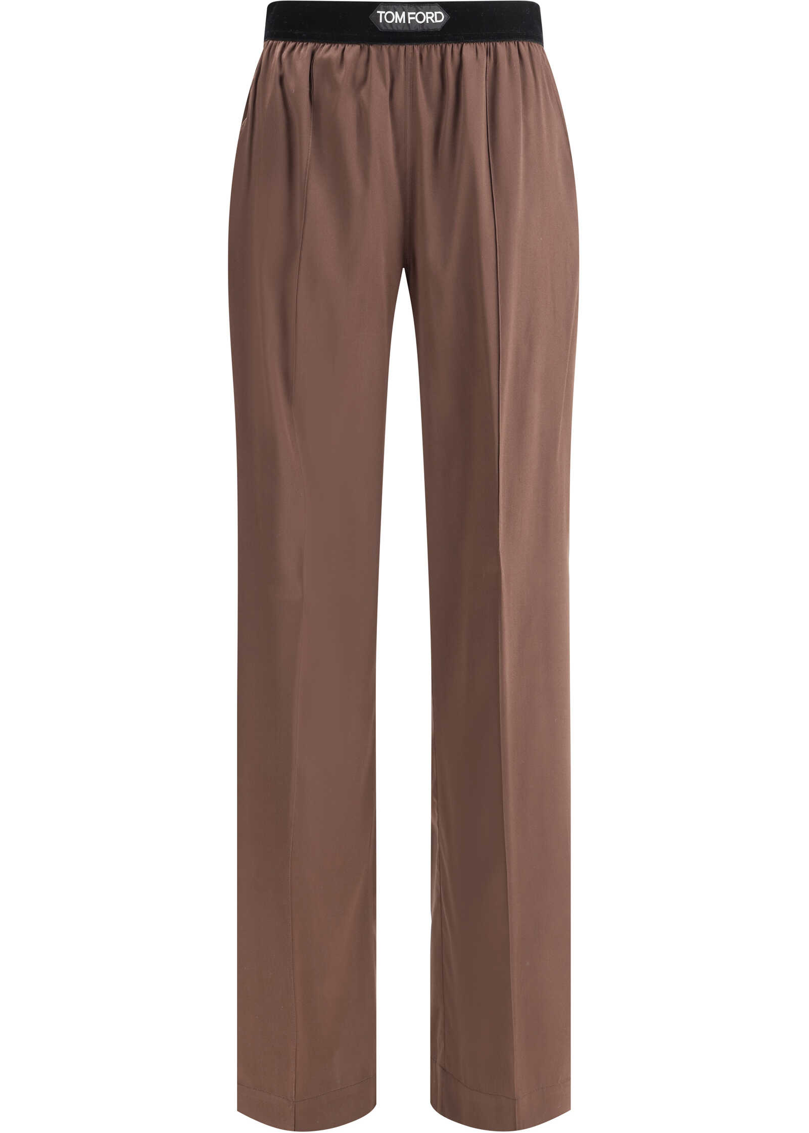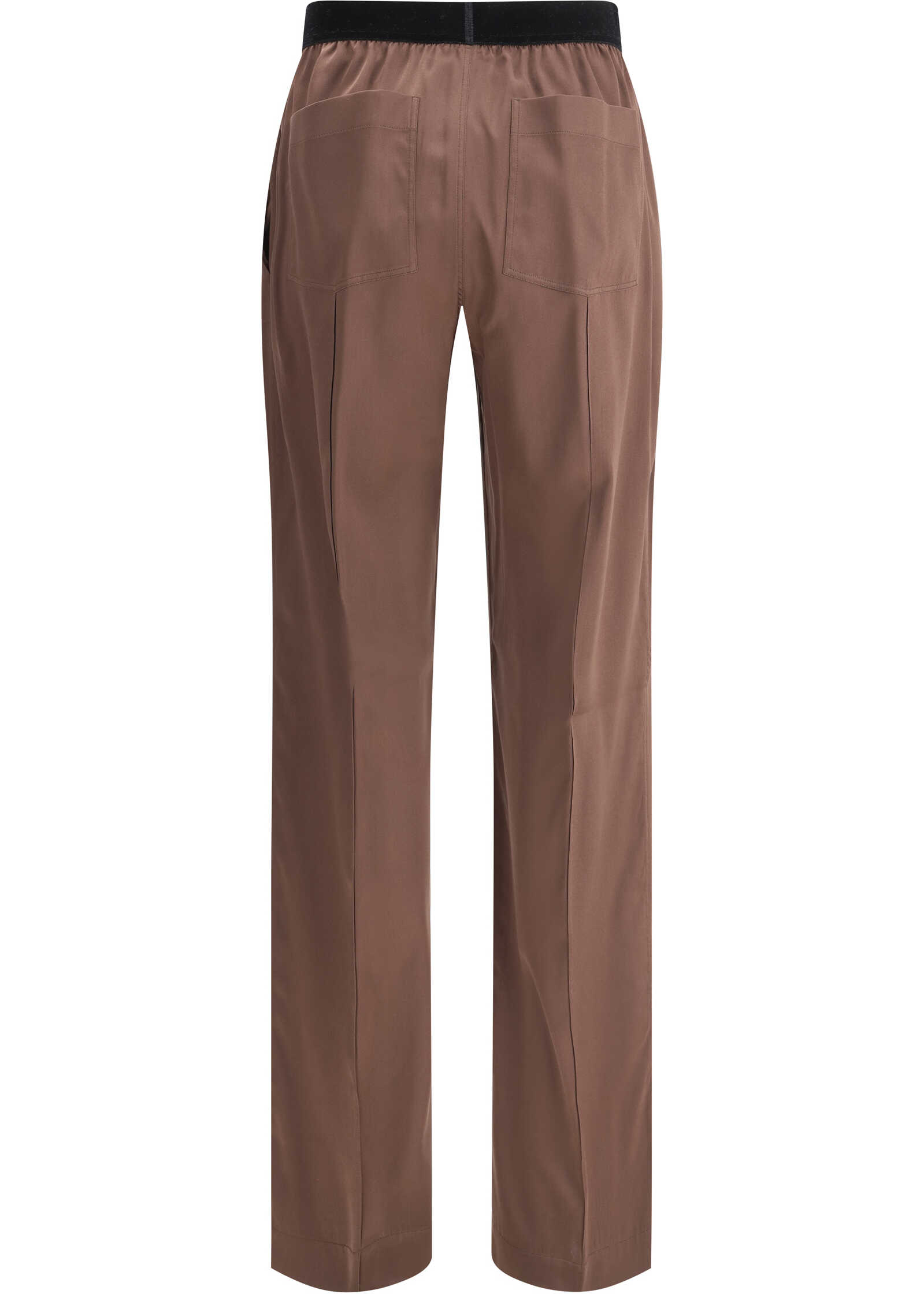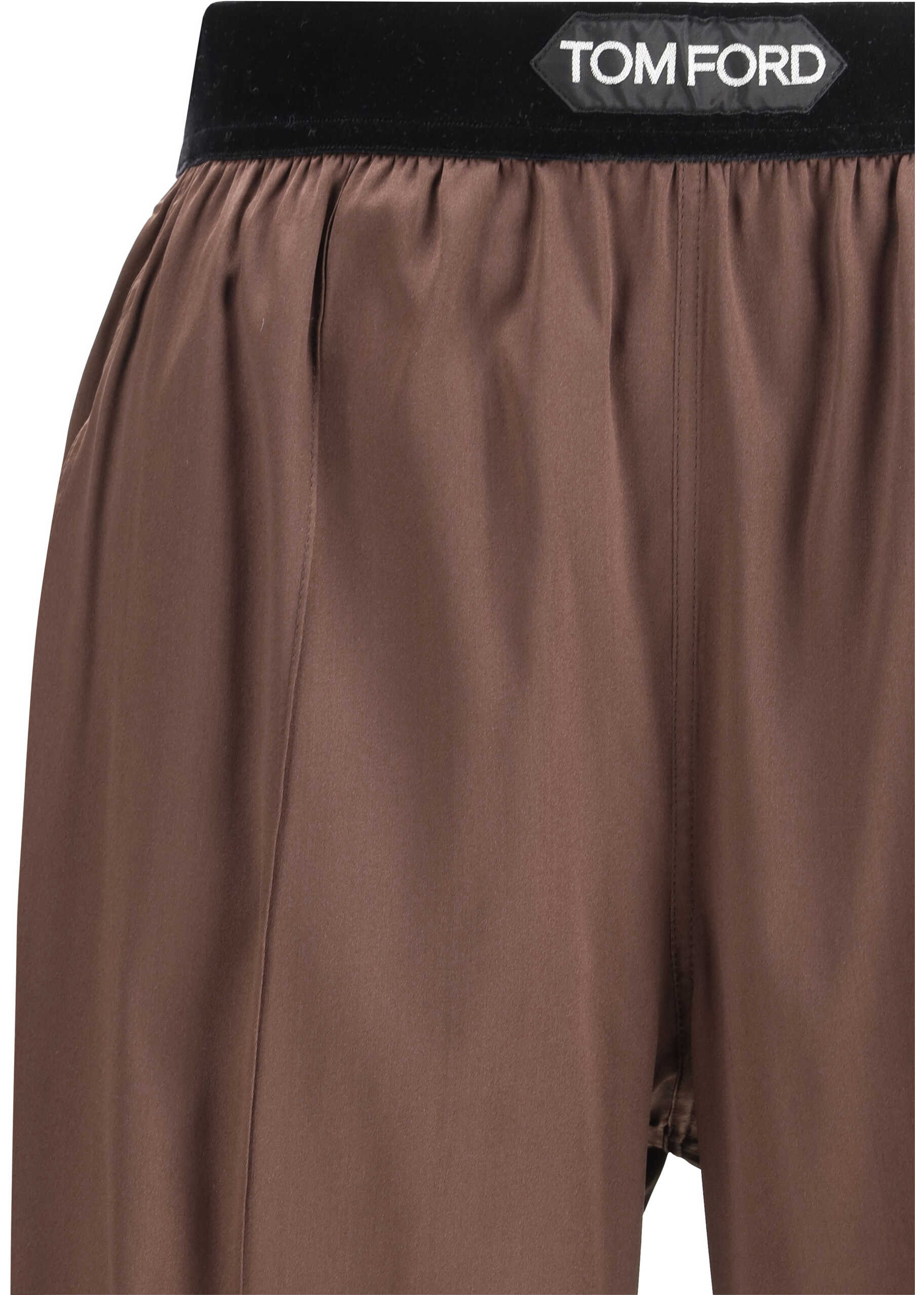 Silk Pants by Tom Ford, contrasting elastic waistband with brand logo printed on front, two slash pockets on front, two welt patch pockets his back.