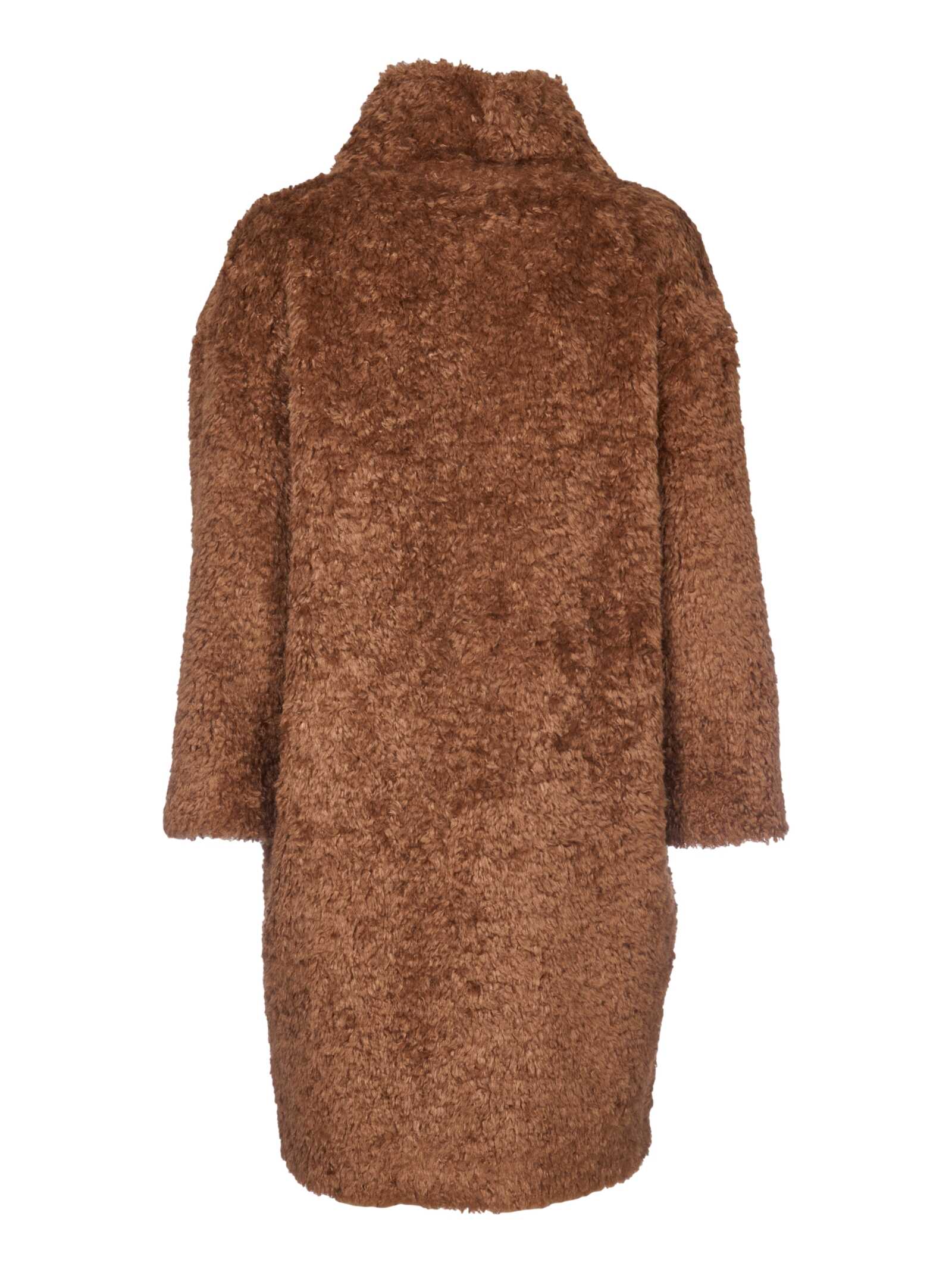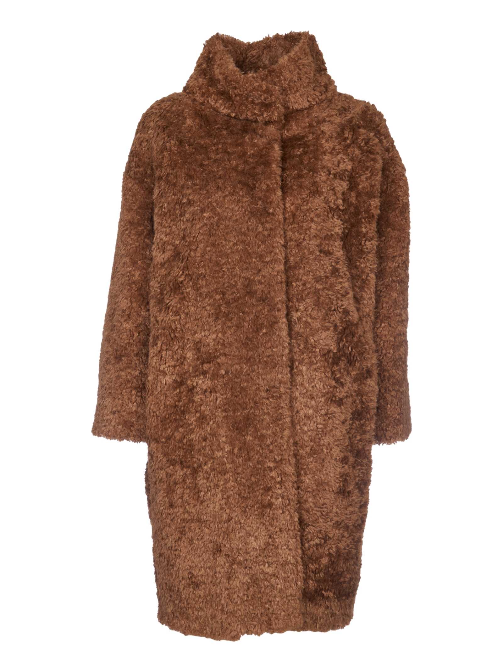 Stay cozy and stylish in this luxurious brown Teddy Coat from HERNO. Crafted with soft teddy fur and a tone-on-tone internal lining, this knee-length coat features an oversized fit, standing collar, side welt pockets, and hidden snap button closure. Made in Romania with 100% polyester, it's the perfect addition to your winter wardrobe. Elevate your look with this chic and versatile piece.