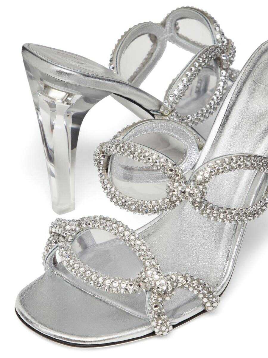 Chain 1967 embellished slide sandals from VALENTINO GARAVANI featuring silver-tone, silk blend, lambskin, calf leather, metallic finish, double-strap design, 3D detailing, crystal embellishment, open toe, branded insole, transparent block heel and slip-on style.