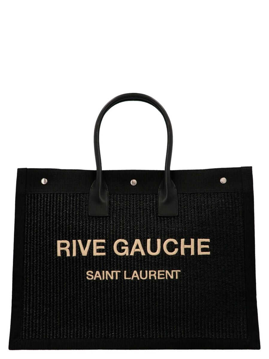 Black raffia and canvas Rive Gauche shopping bag Width: 48 cm Height: 36 cm Depth: 15 cm Handle height: 15 cm