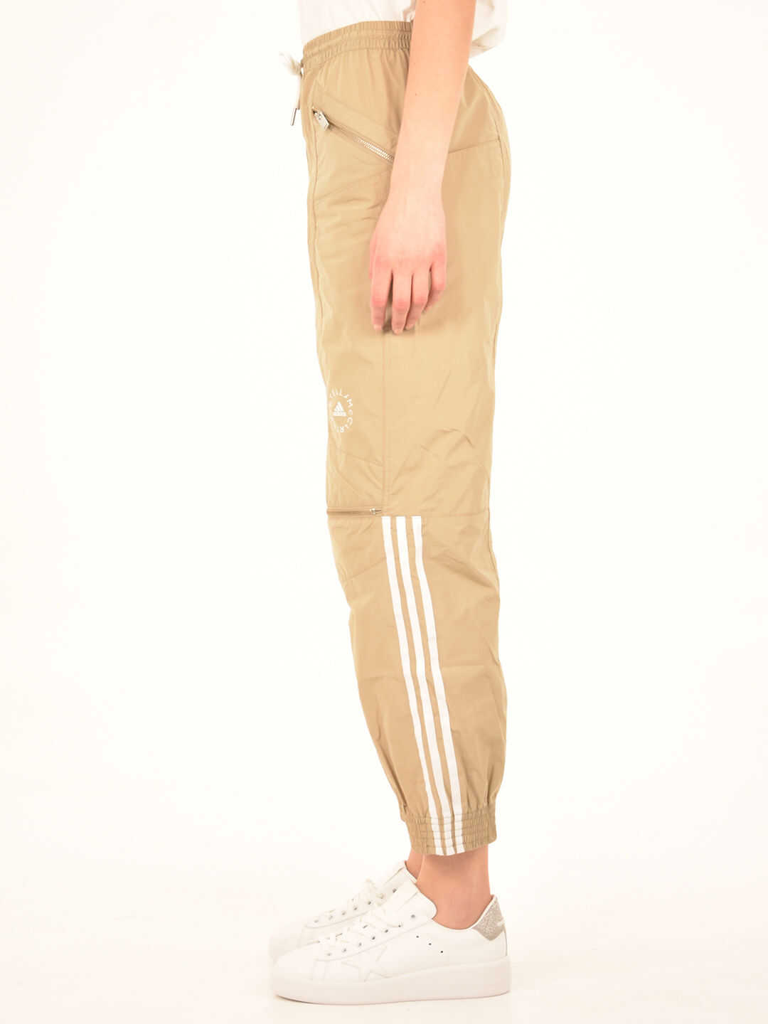 Beige sports trousers with zip at the knees and side pockets with zip. White stripes along the bambe and logo on the front. Elasticated waist and bottom.