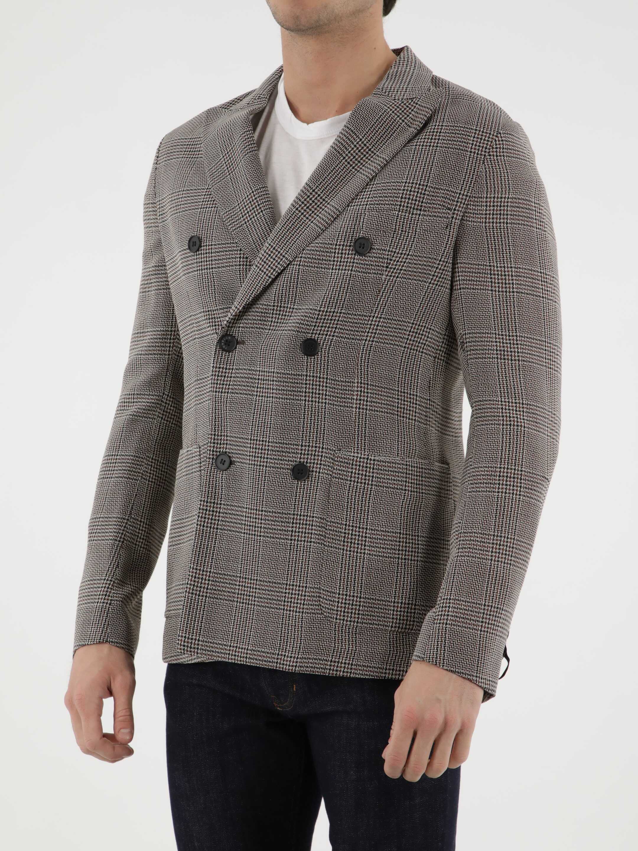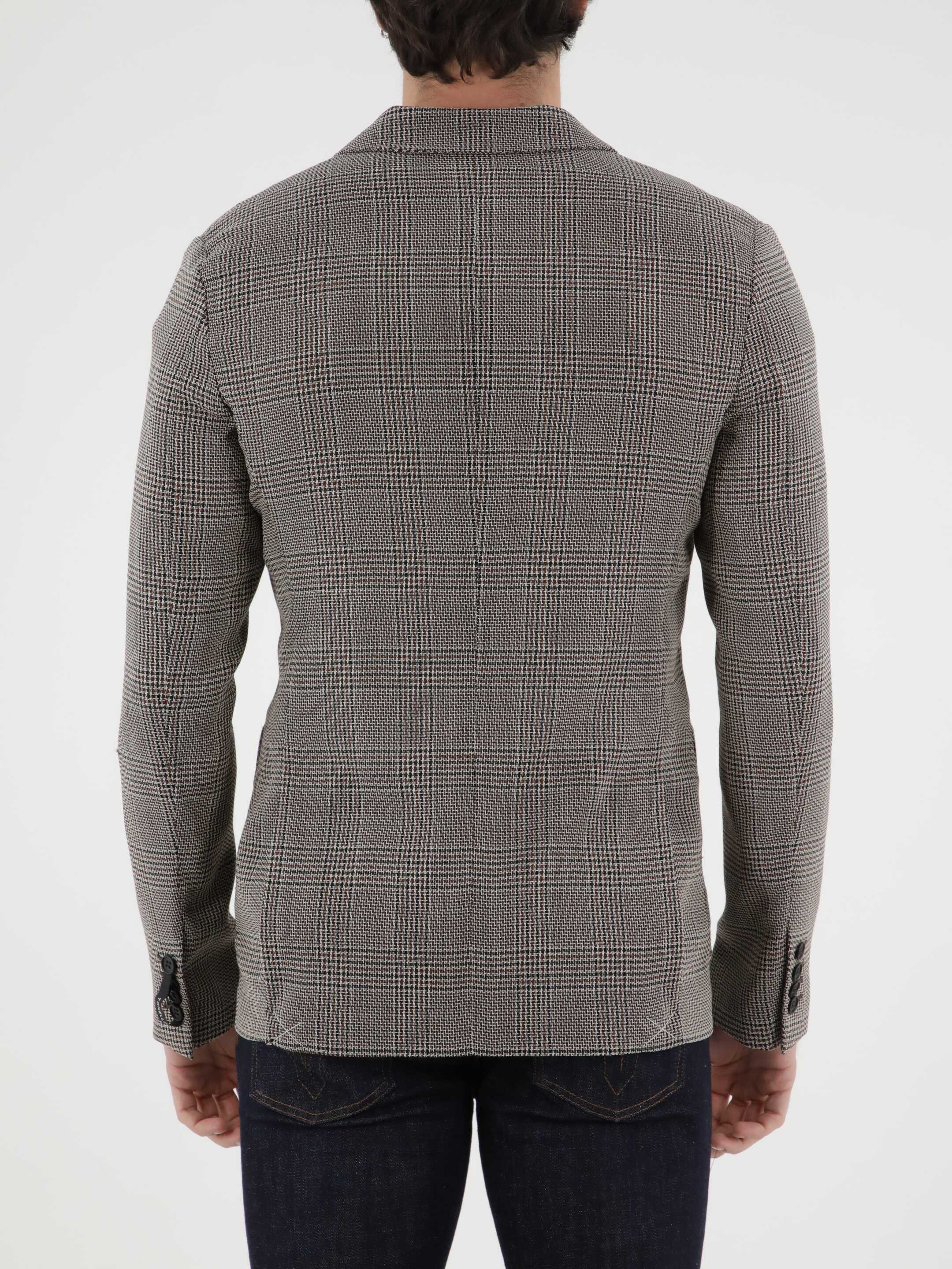 Glen plaid virgin wool jacket with double-breasted closure. It features peaked lapels, two side patch pockets, one welt pocket on chest and buttoned cuffs.