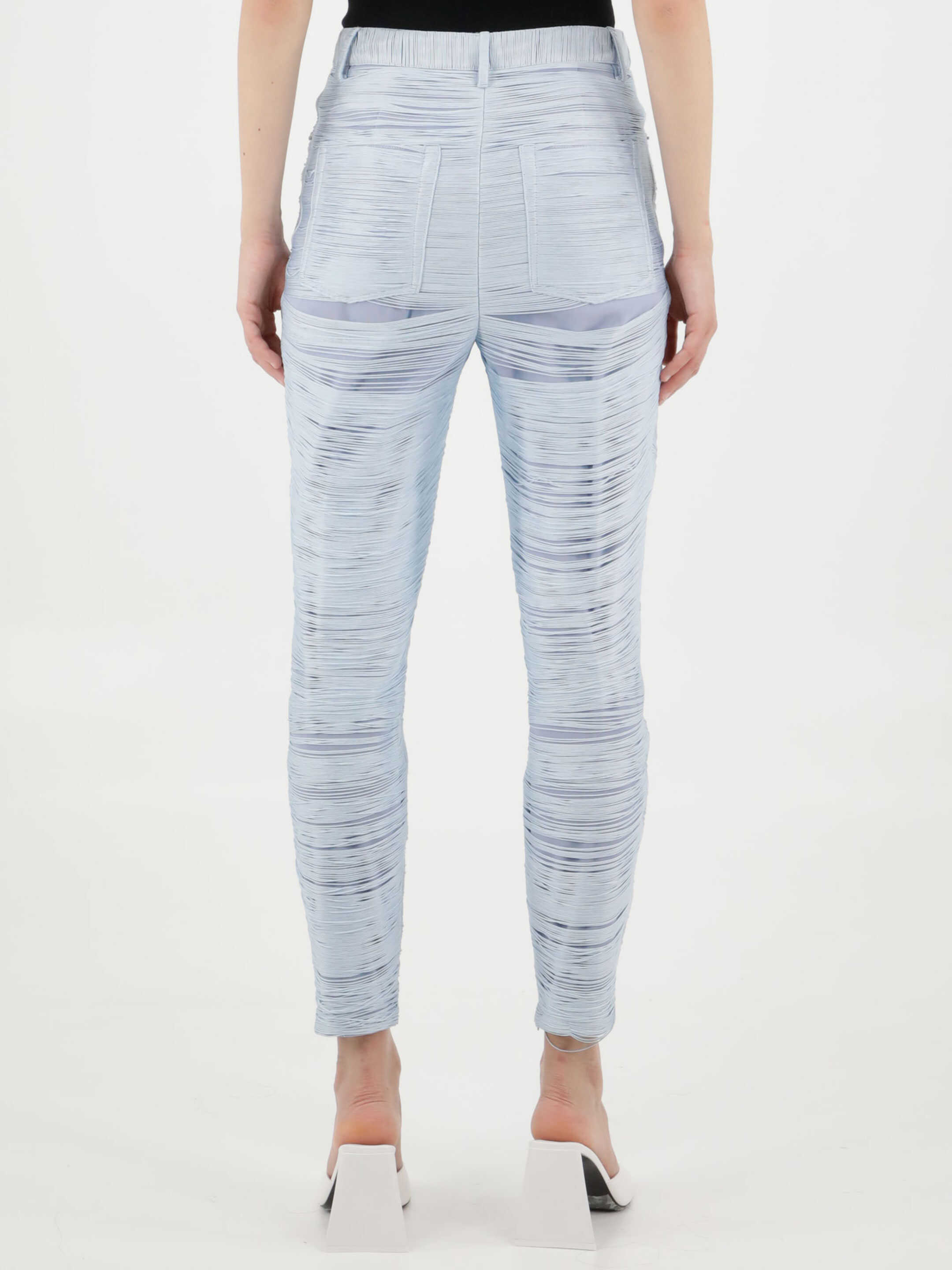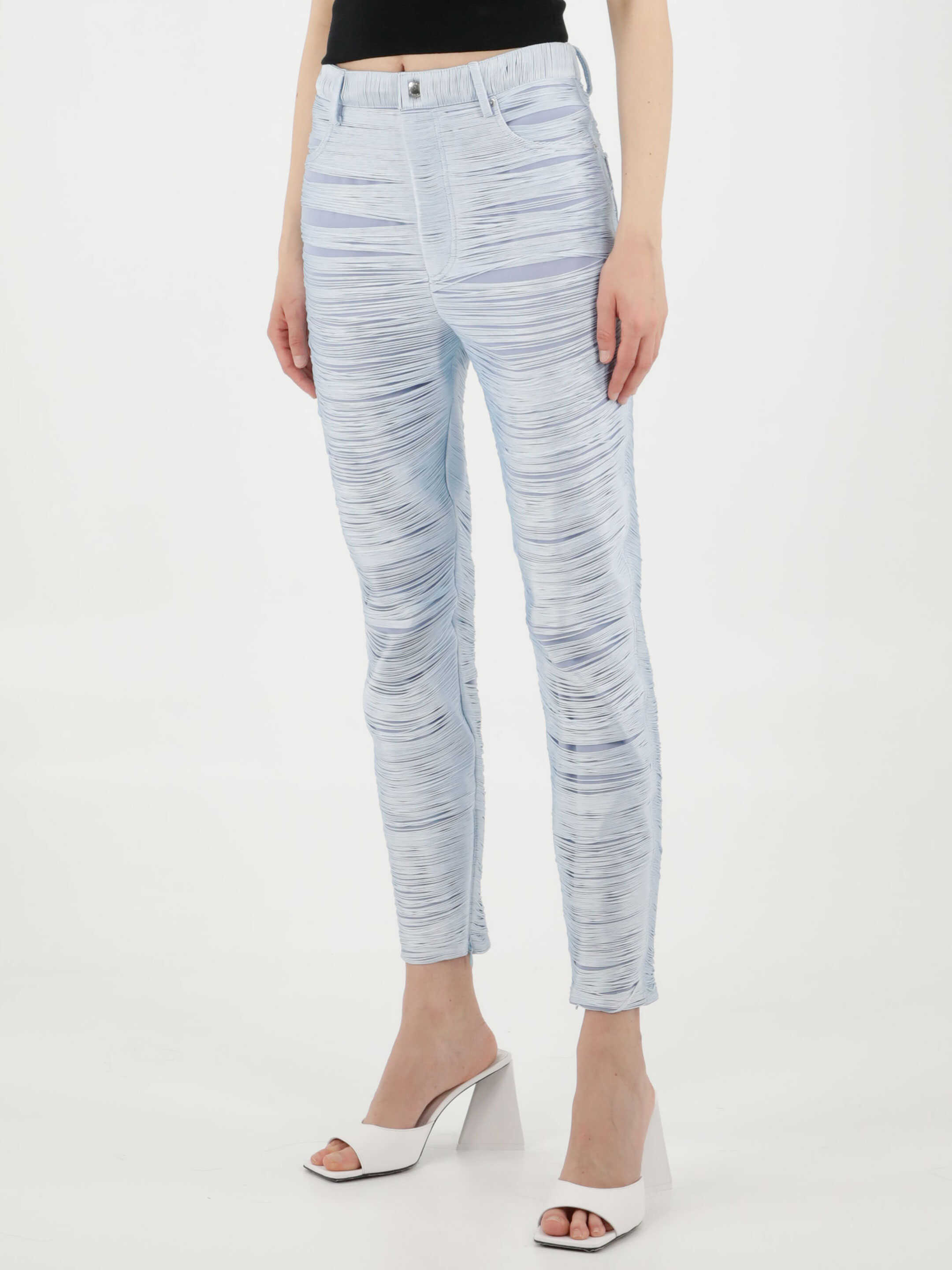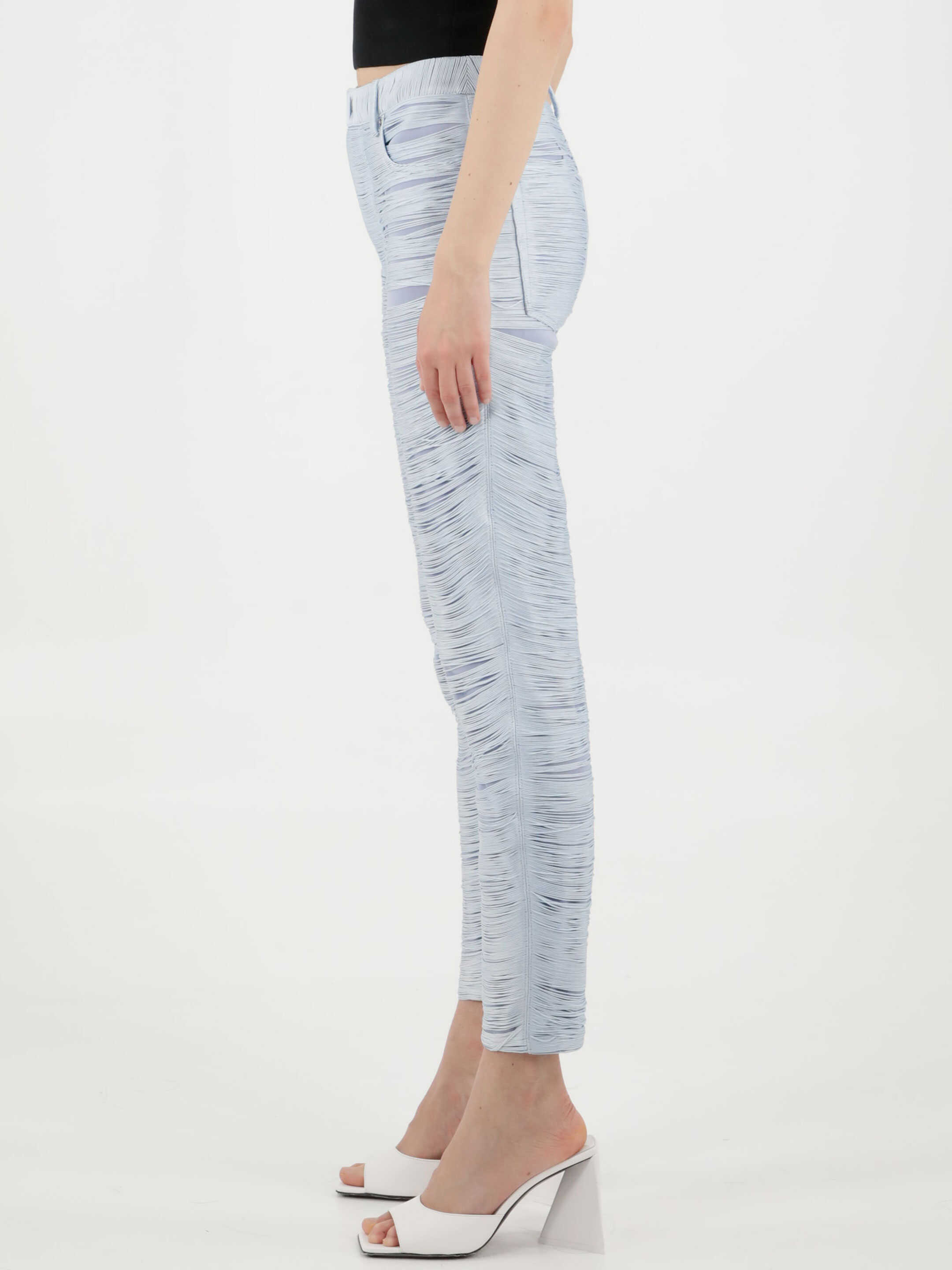 Light-blue power mesh pants with draped fringe overlay. It features front zip and button closure, five pockets design, zip detail on ankles and tight fit.