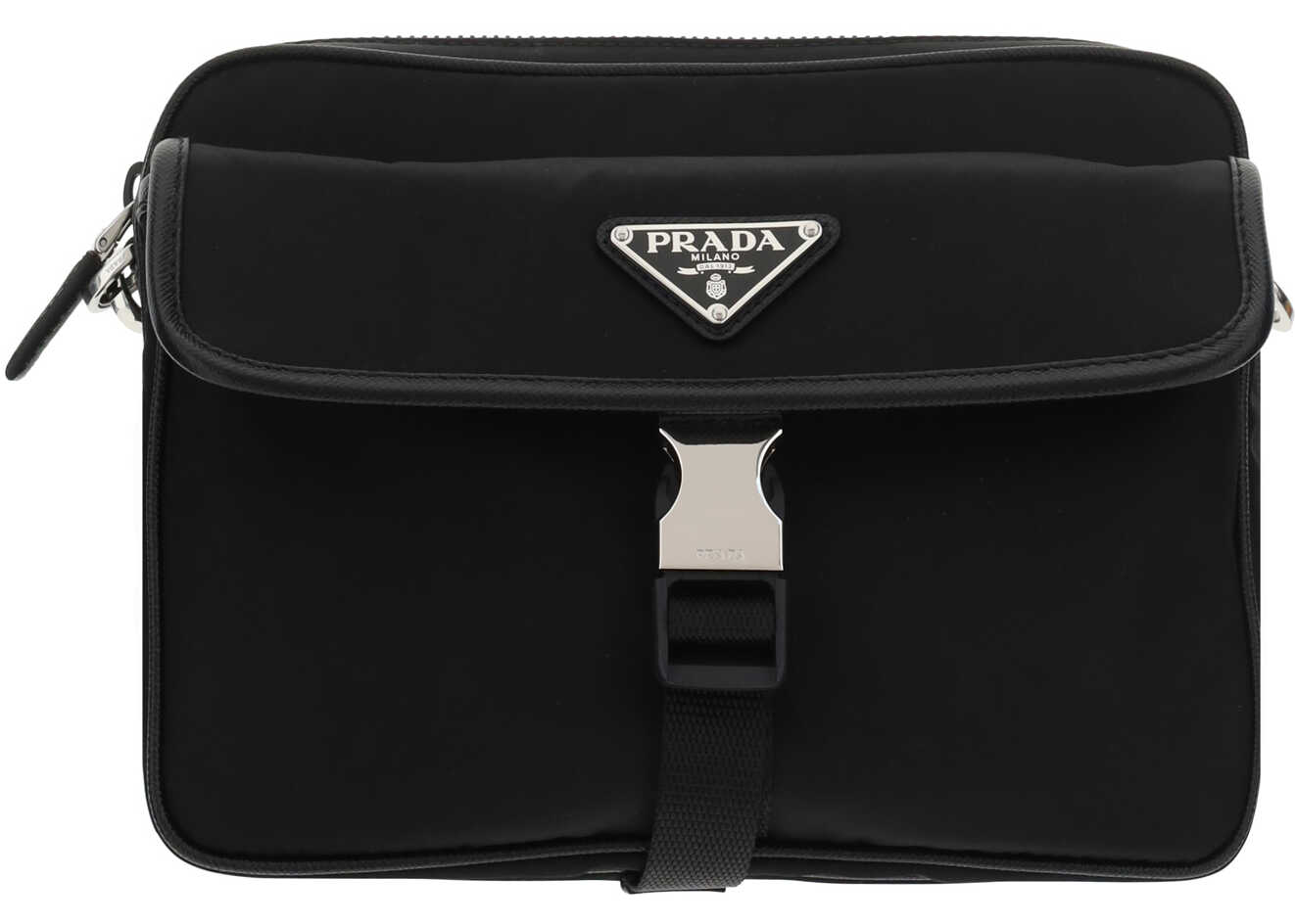 Nylon Shoulder Bag by Prada, adjustable and removable shoulder strap with embroidered brand signature, removable mini pouch with zipper, triangular brand monogram plaque applied embossed on pouch, front push lock closure, iconic brand triangle applied embossed on flap, double interior compartment, top zipper closure.