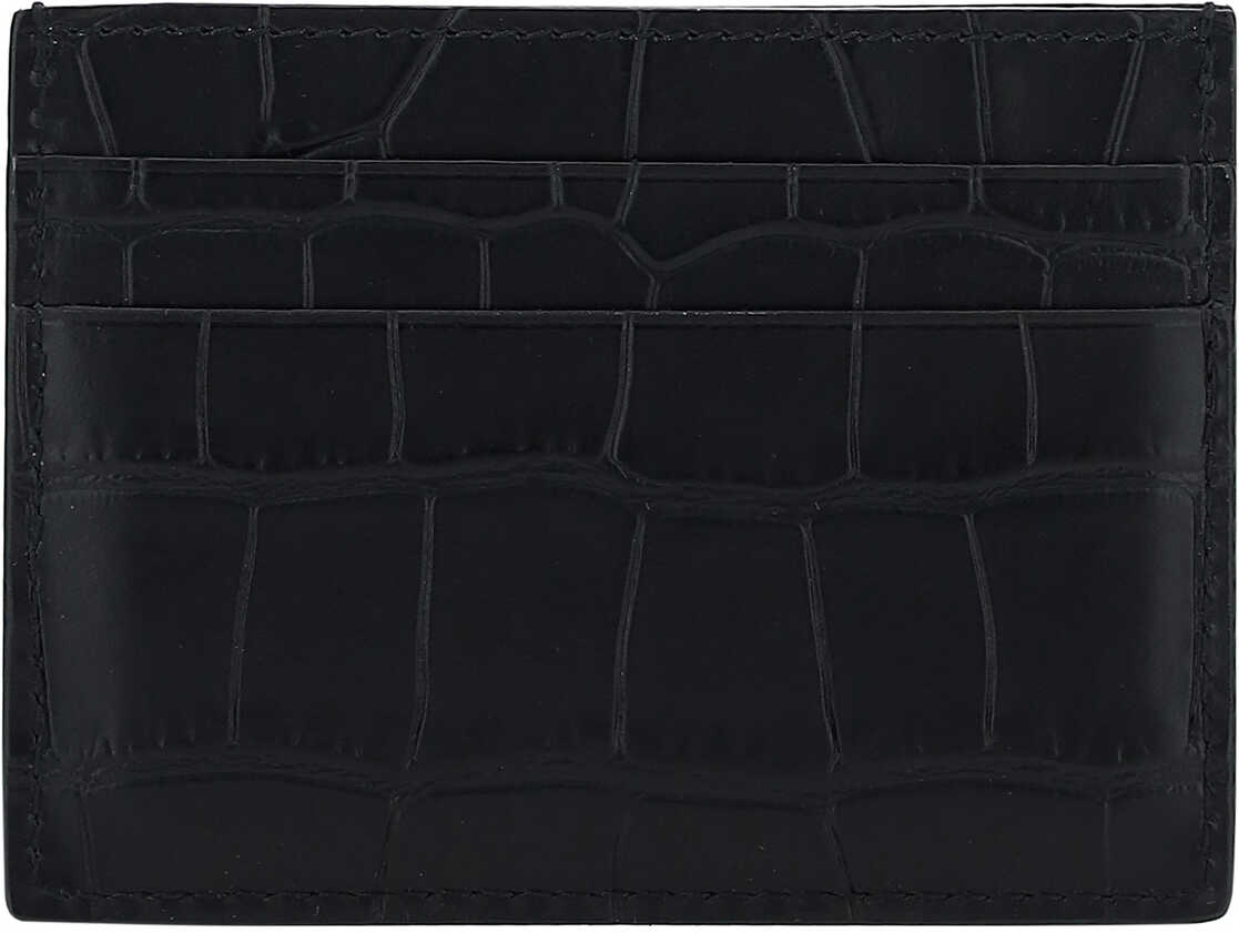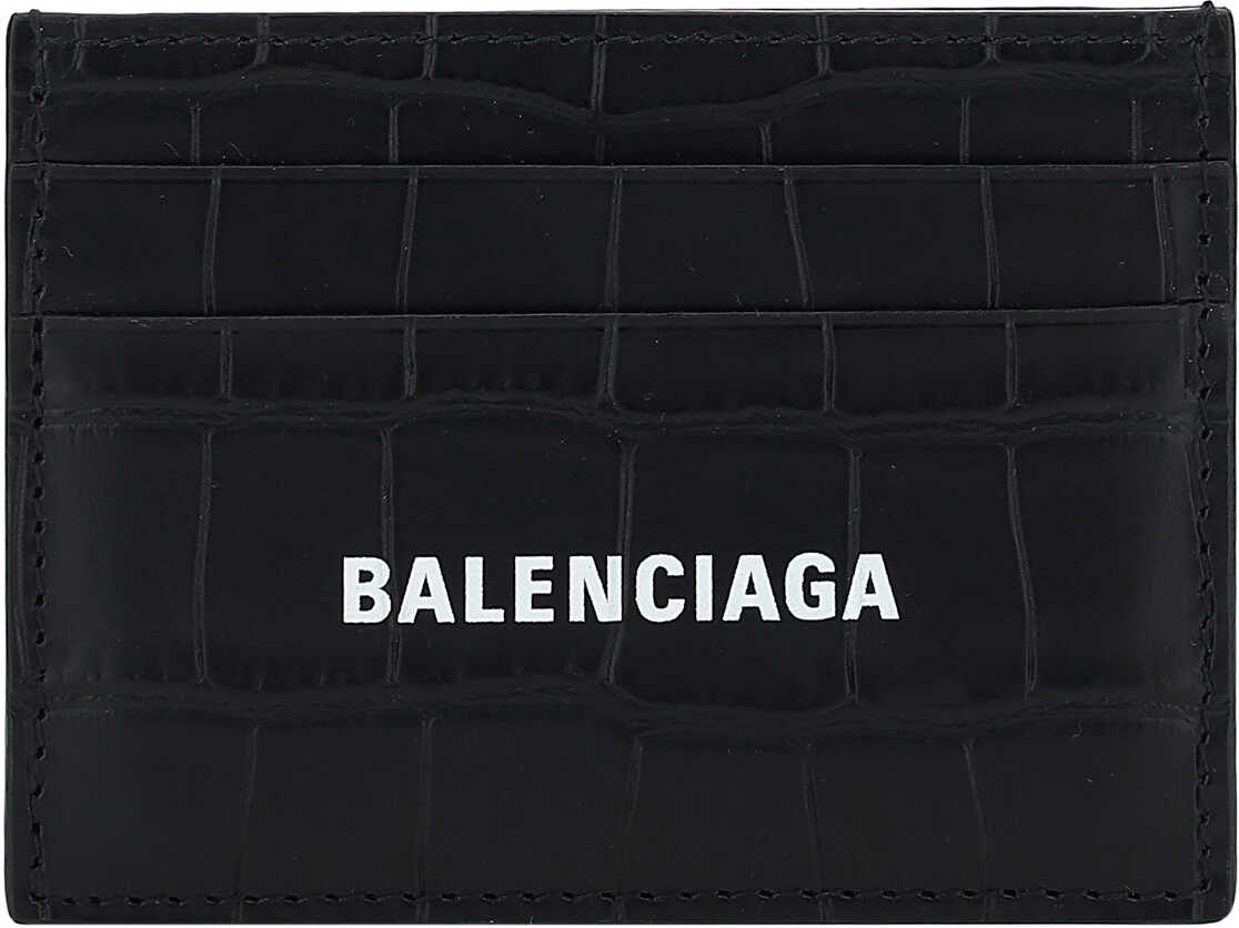 Calfskin Card Holder by Balenciaga, croc-effect leather design, card slots on front and back, contrasting iconic brand monogram on front.