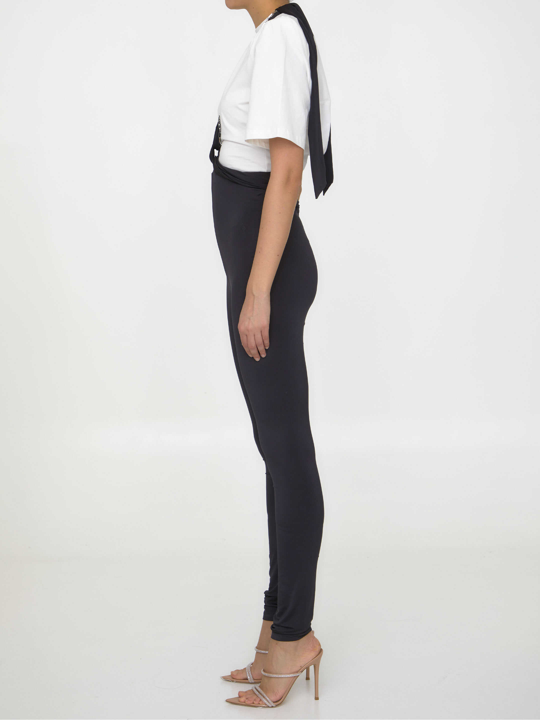 Ruby long pants in black second-skin jersey with front draping details. It features sash around the neck, metal chains and logo metal plate. Zip closure at the back. Tight fit.
