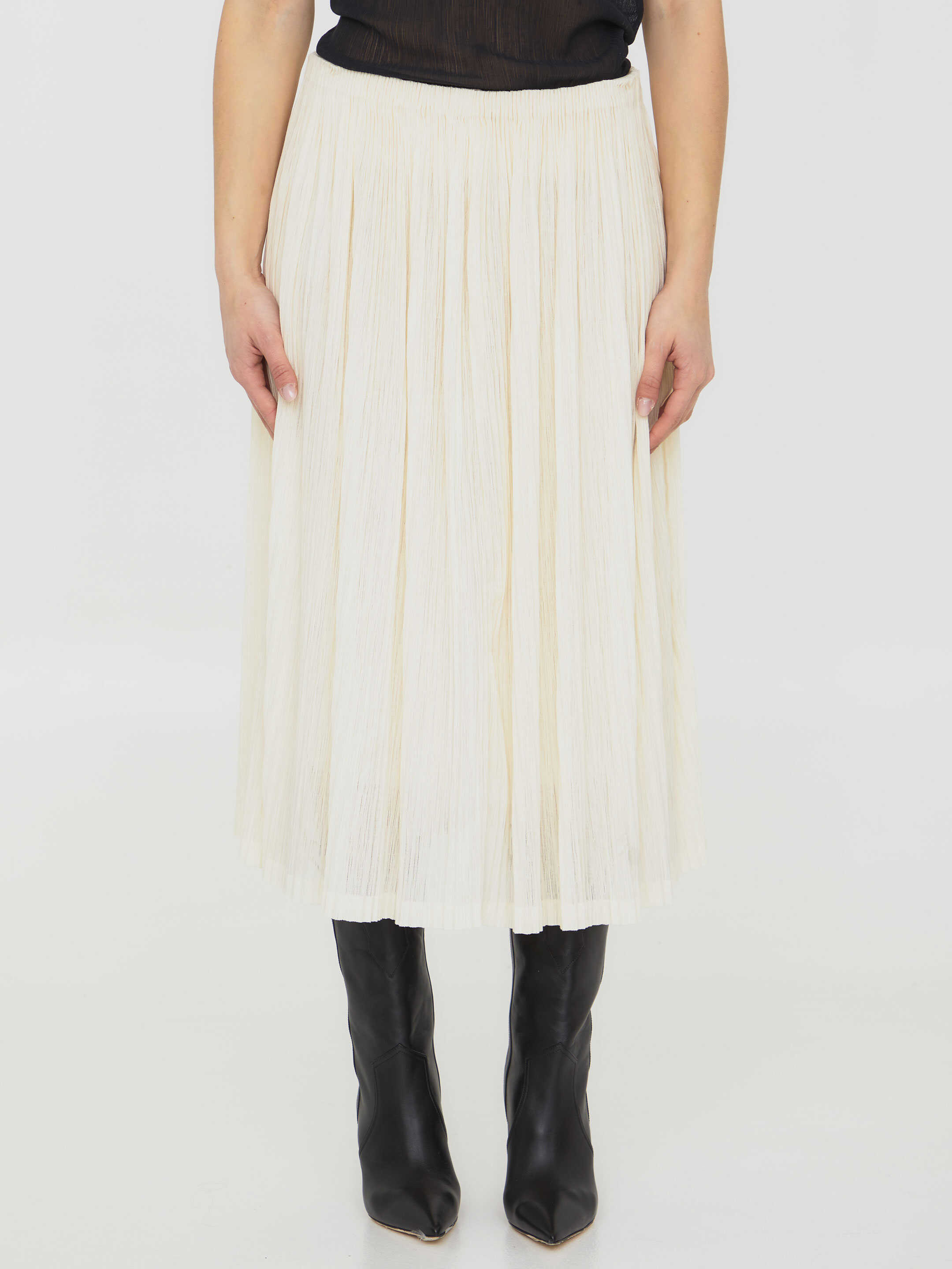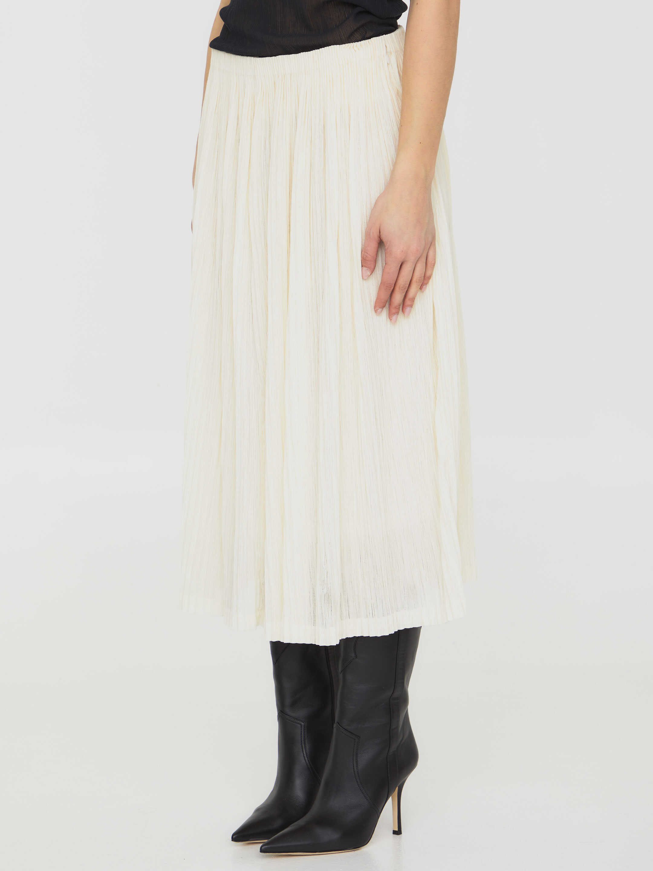 Pleated midi skirt in ivory cotton blend. Stretch waistband.
