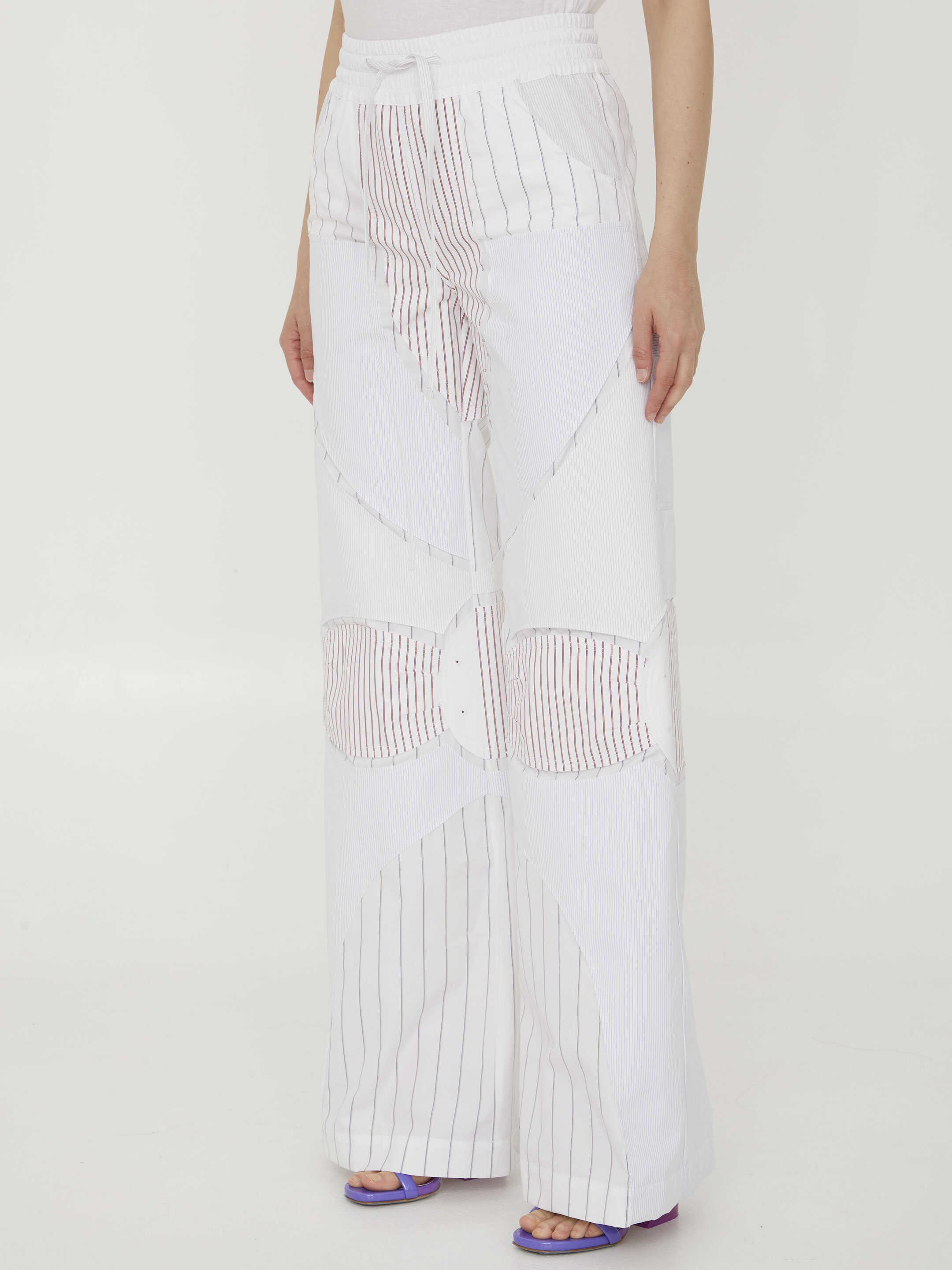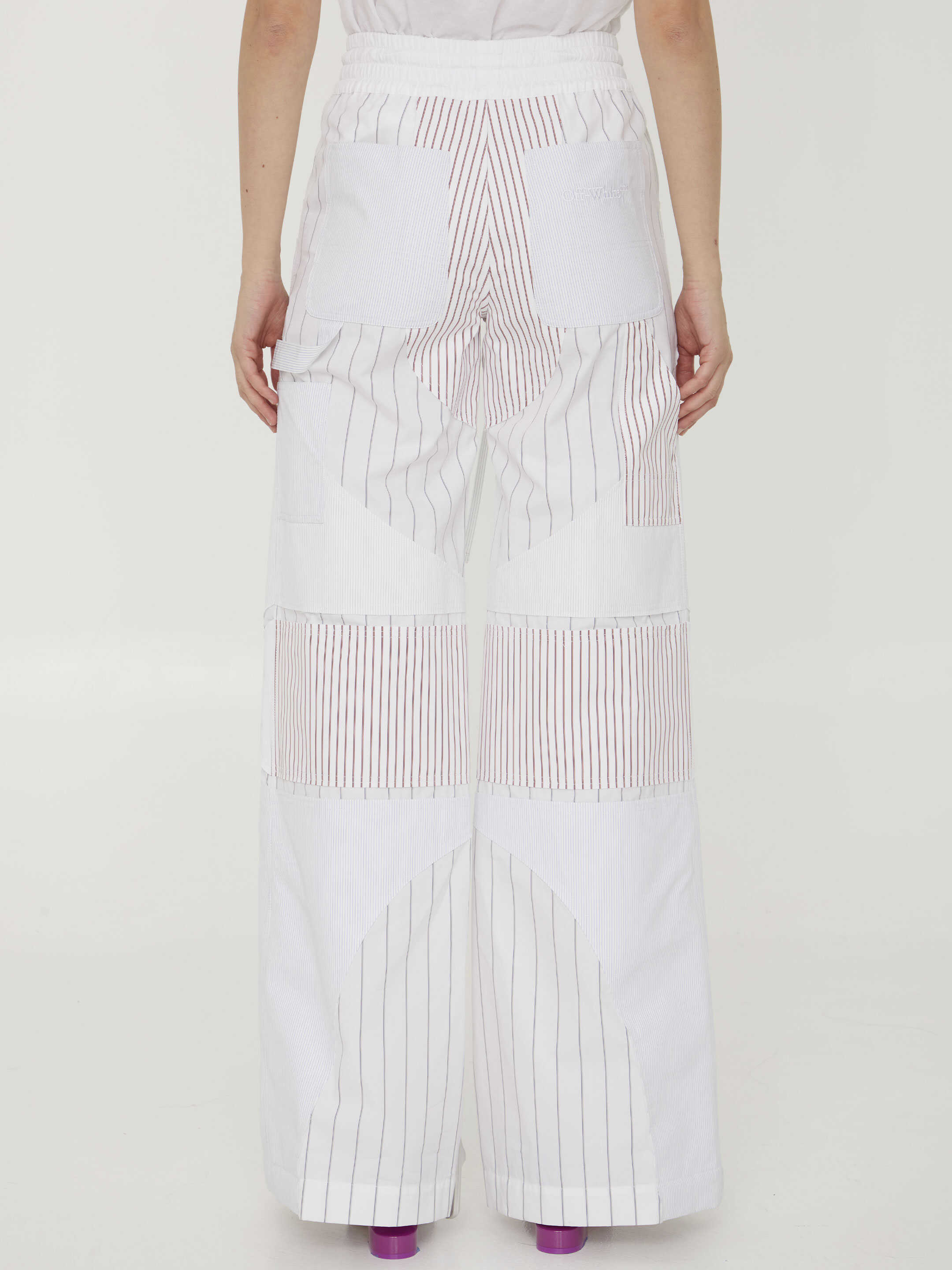 Motorcycle pants in white cotton poplin with contrast striped details and inserts. It features stretch waistband with drawstring, two side welt pockets, two rear patch pockets and two additional rear pockets. Off-White logo embroidered at the back.
