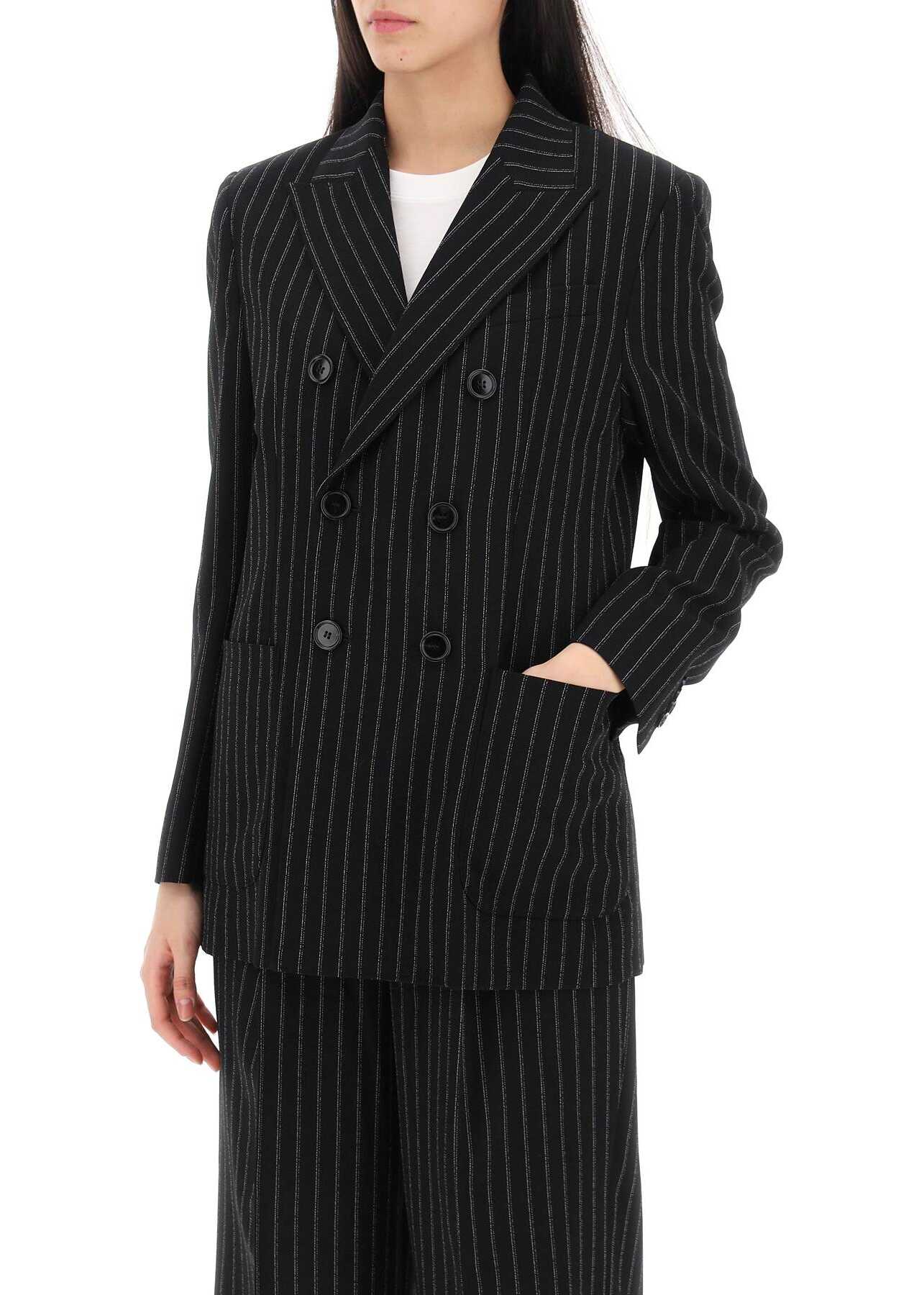 This Ami Paris blazer is made of virgin wool pinstripe crepe, featuring a double-breasted design with a straight and regular cut and lightly padded shoulders. It has peak lapels, a welt pocket on the chest, flap pockets, and buttoned cuffs. The finishing touches include tailored stitching and a back center vent. Fully lined and equipped with inner pockets. The model is 177 cm tall and wears a FR size 36.