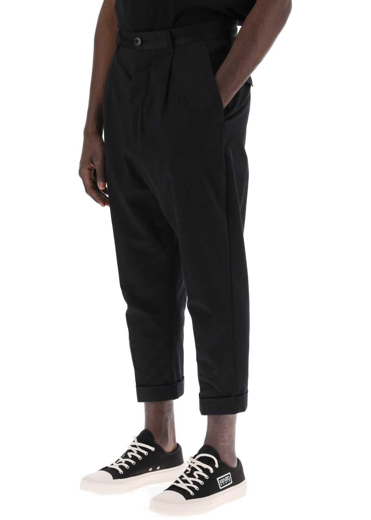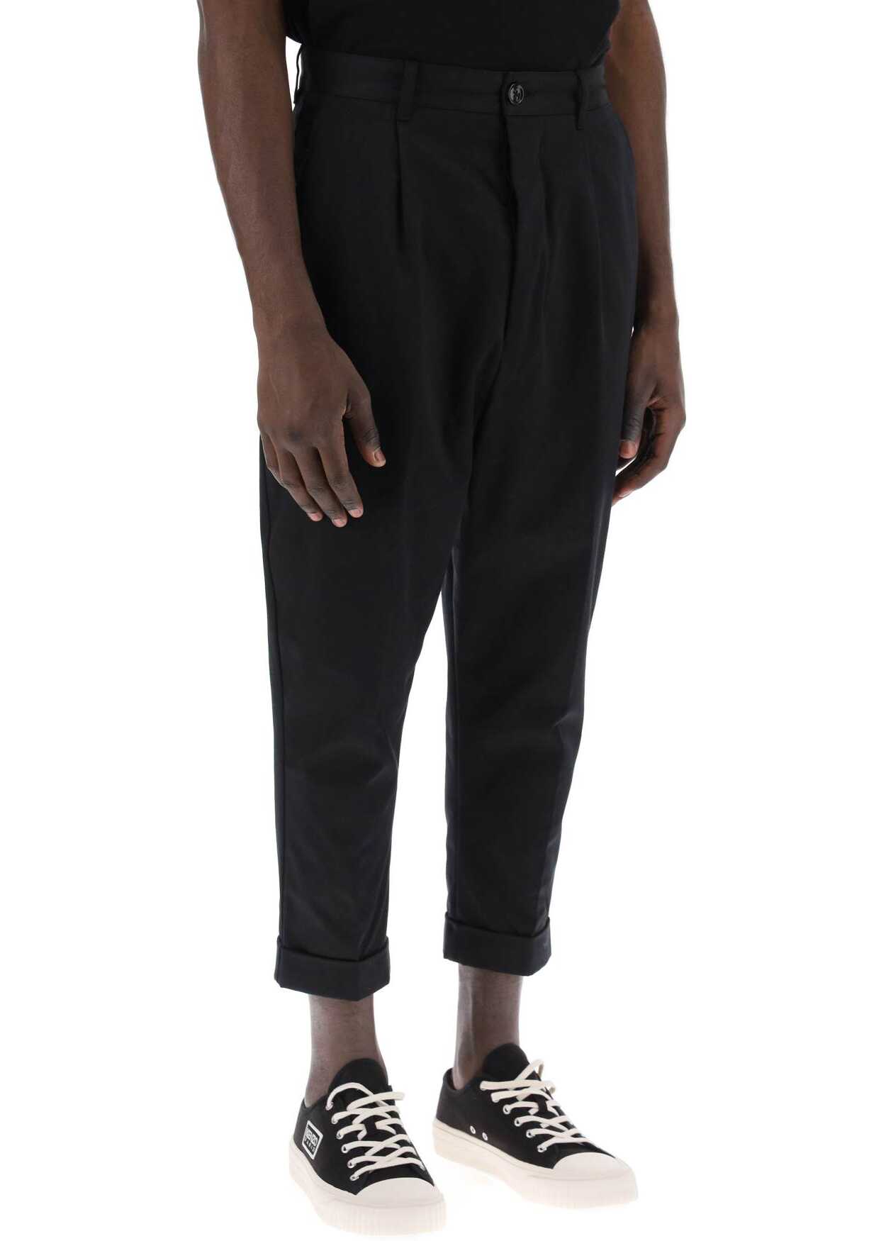 Ami Paris cotton trousers with a wide carrot cut, medium waist and pressed pleat. Four-pocket style, hidden button closure and rolled hem. Oversized fit. The model is 187 cm tall and wears size M.