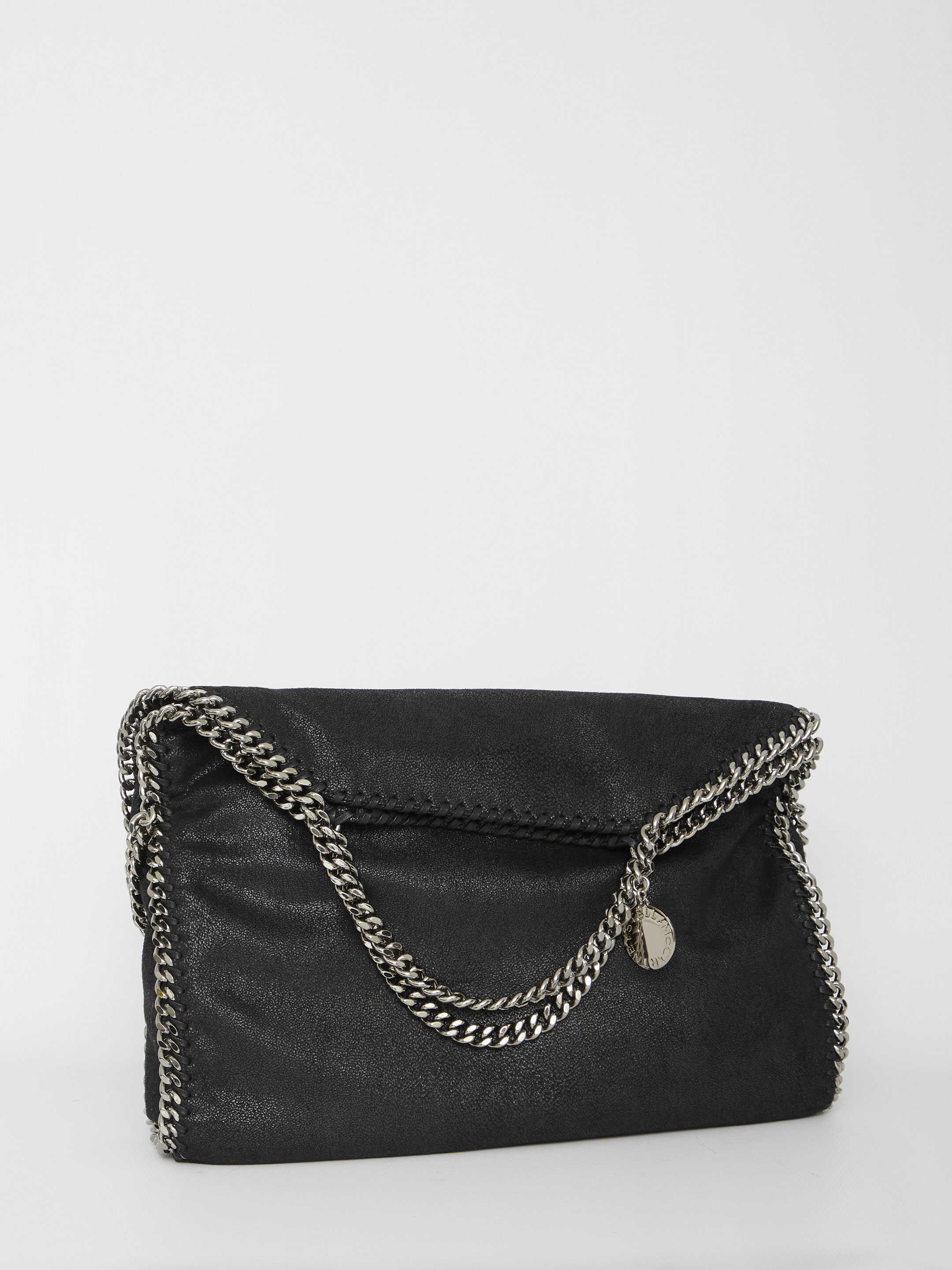 Falabella Fold Over Tote bag in black vegan fabric with three silver-tone diamond-cut chain. It features press-stud closure, one main interior compartment and one interior zip pocket.