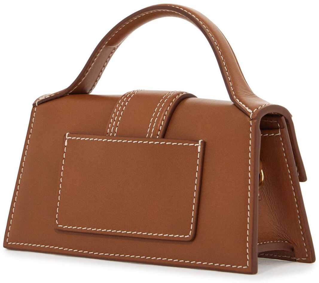 "Le Bambino" leather mini bag by Jacquemus enriched by the metal lettering logo applied on front. Carriable by hand with the top handle or crossbody with the adjustable and detachable shoulder strap. Rear patch pocket, flap with magnetic closure, cotton lining and gold-finished metalware.