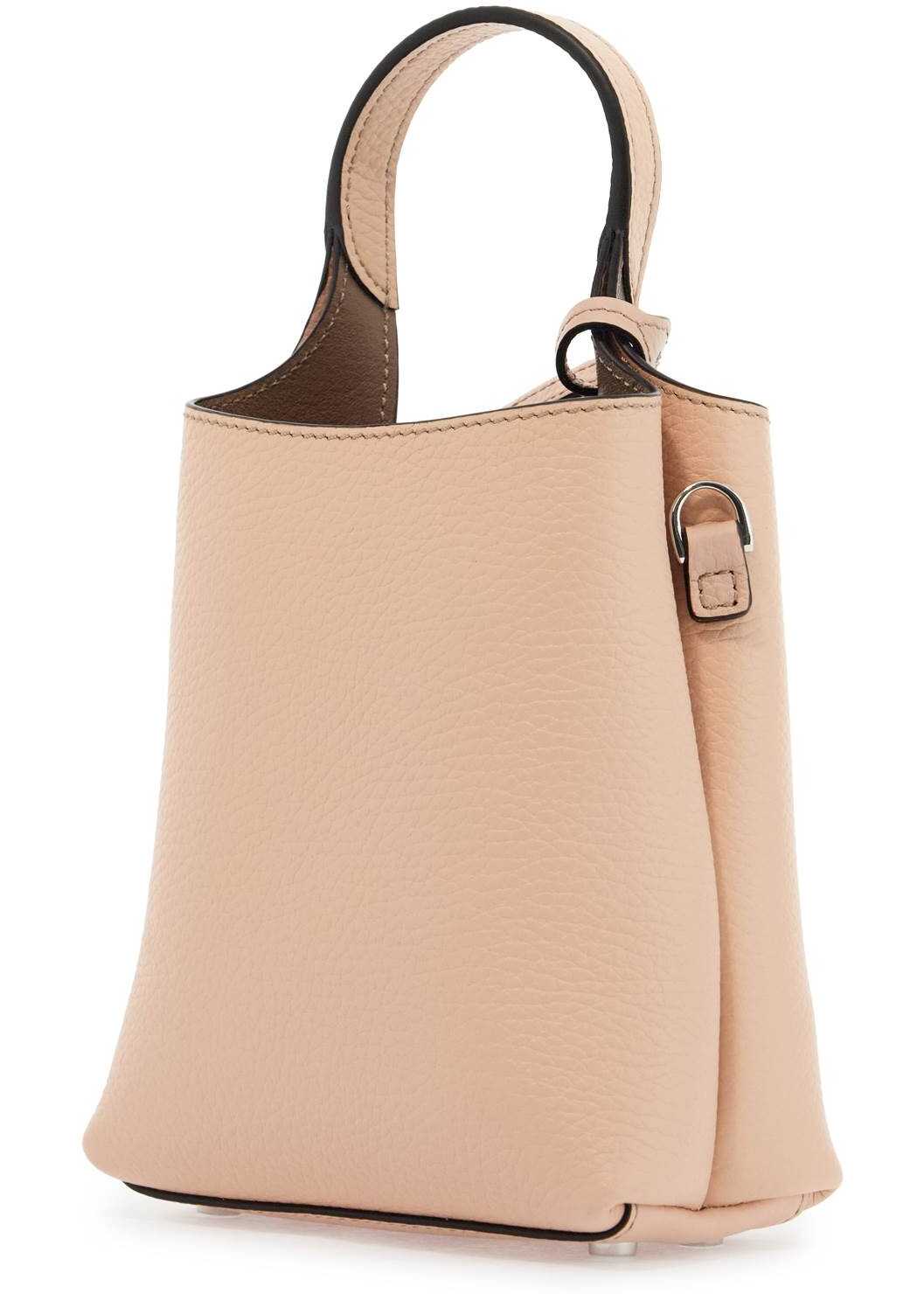 This mini Tod's bag is made of hammered leather with an embossed lettering logo and a removable T Timeless accessory in silver metal. The interior features a central open pocket, protective feet at the base, and an adjustable and removable shoulder strap.