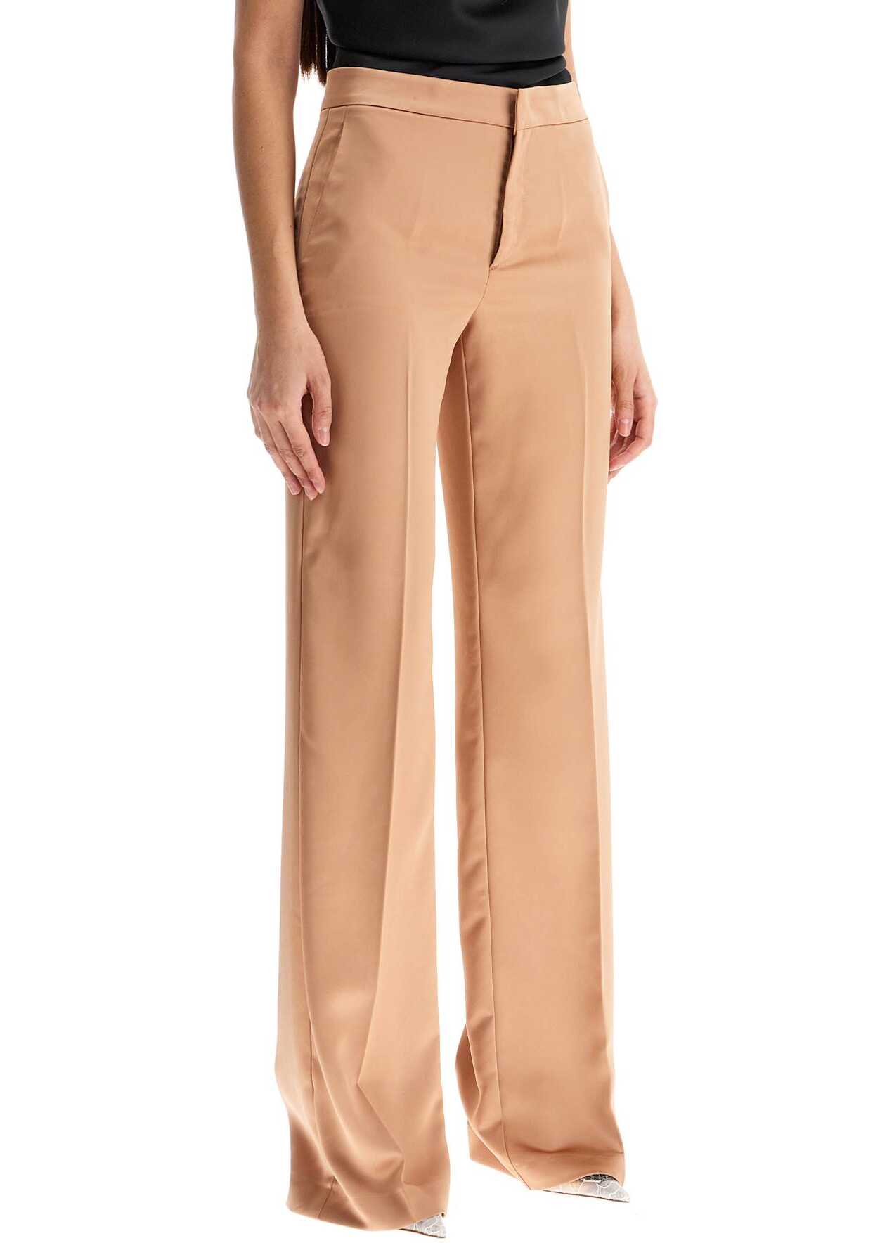 The Andamane Pants are made of satin and feature a flared design with a central pleat. They have a medium waist, zip closure, hidden button and hook, and French pockets. The model is 177 cm tall and wears an Italian size 38.