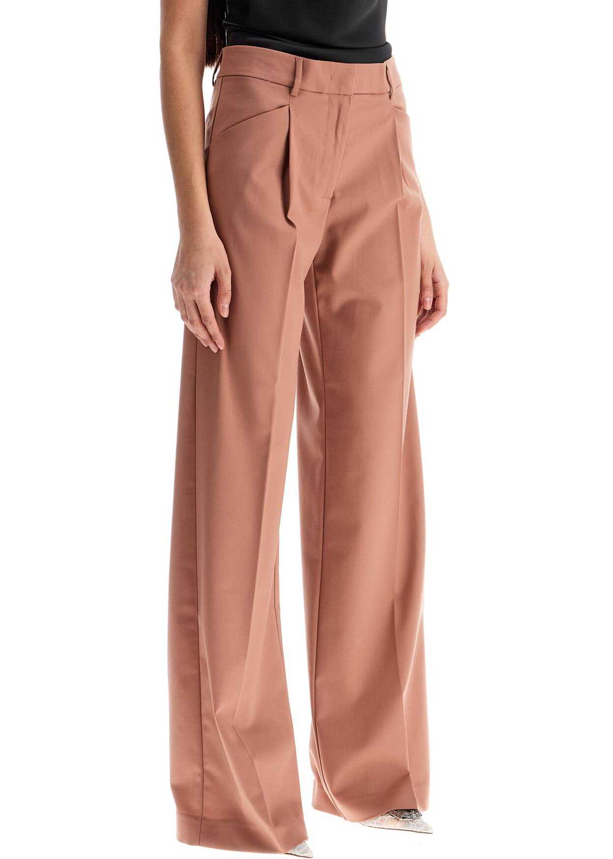 The Andamane's Vissia palazzo pants are made of virgin wool gabardine and feature a high waist, pleats, and a central crease. They have a zip closure with hidden hook and buttons, slanted pockets, and one welt pocket on the back. The model is 177 cm tall and wears an IT size 38.