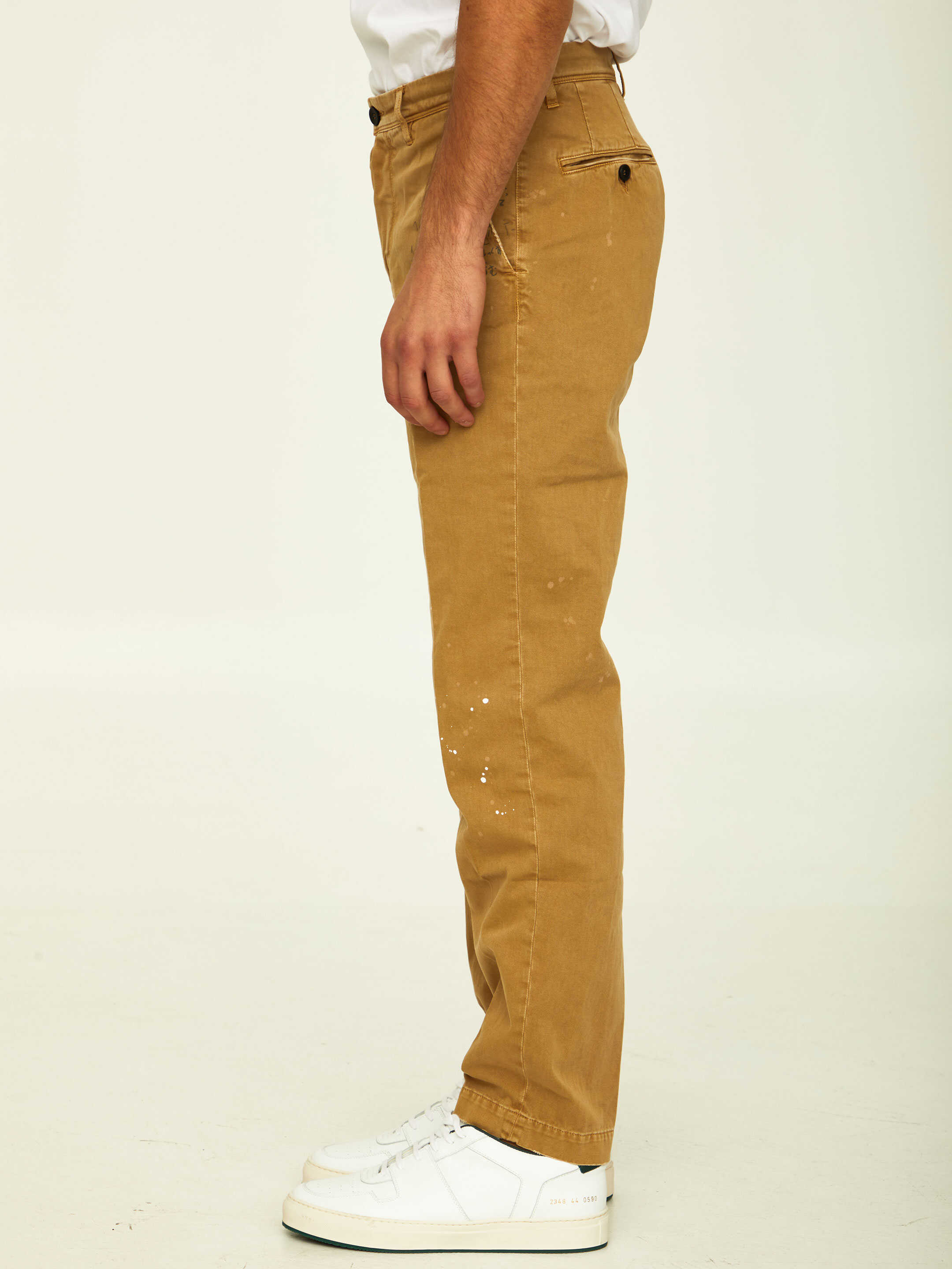 Straight-leg trousers in camel cotton with paint-effect details and black lettering details on the front and on the back. It features zip and button closure, two side welt pockets, two rear buttoned welt pockets and belt loops.
