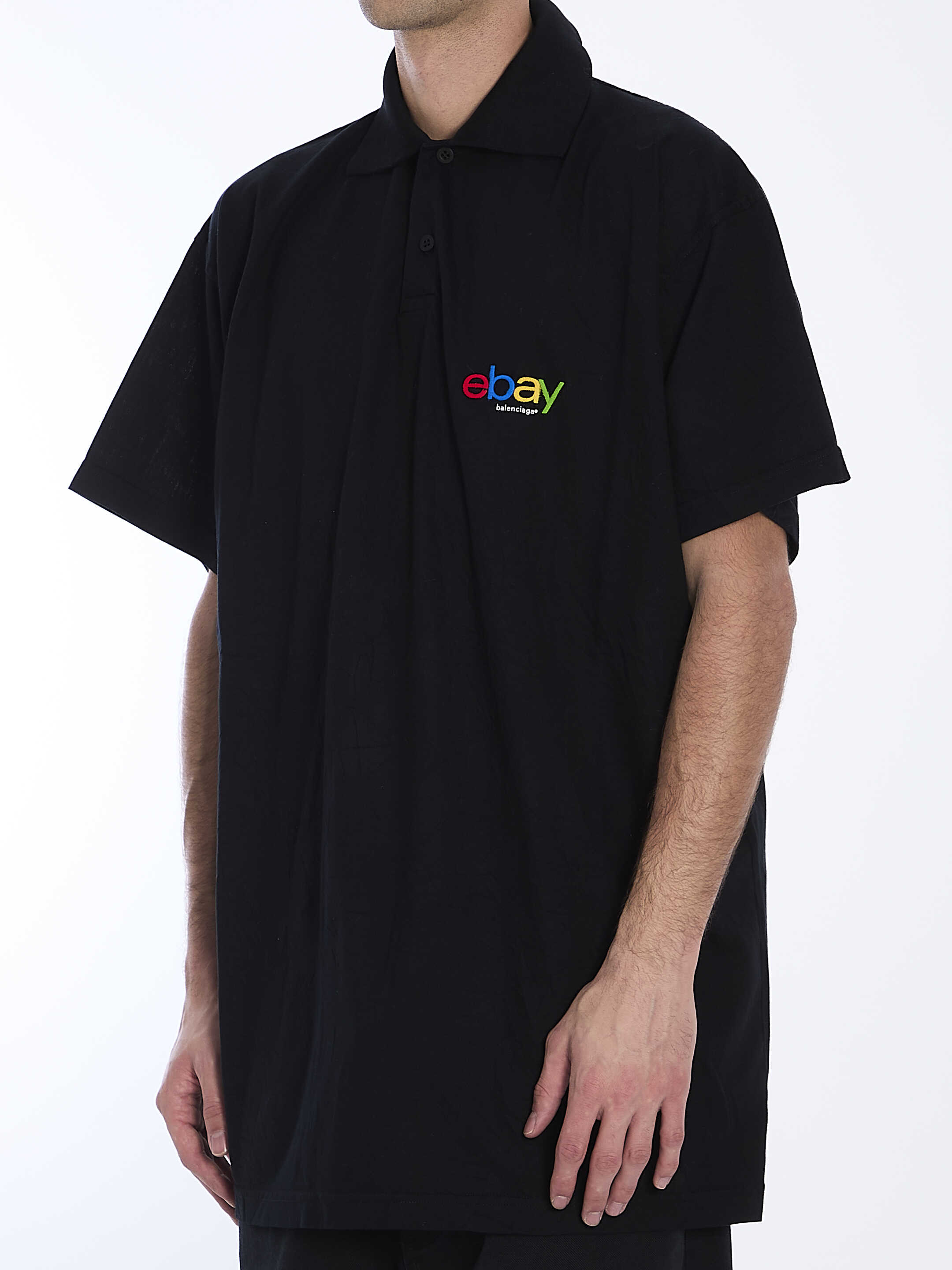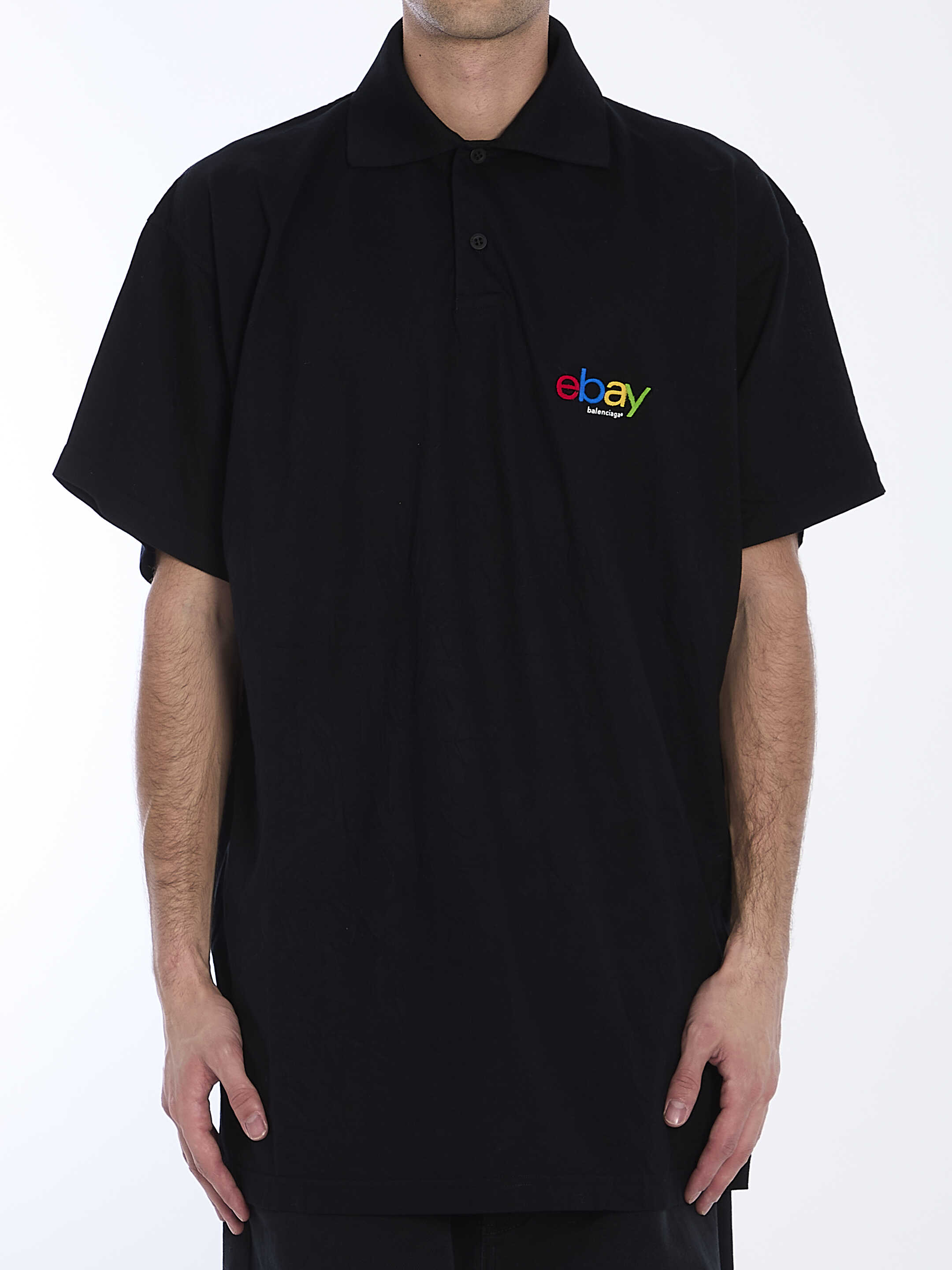 Short-sleeved polo shirt in black piquet cotton with eBay embroidery on chest. It features classic collar and front buttoned placket. Crinkled effect. Oversized fit.